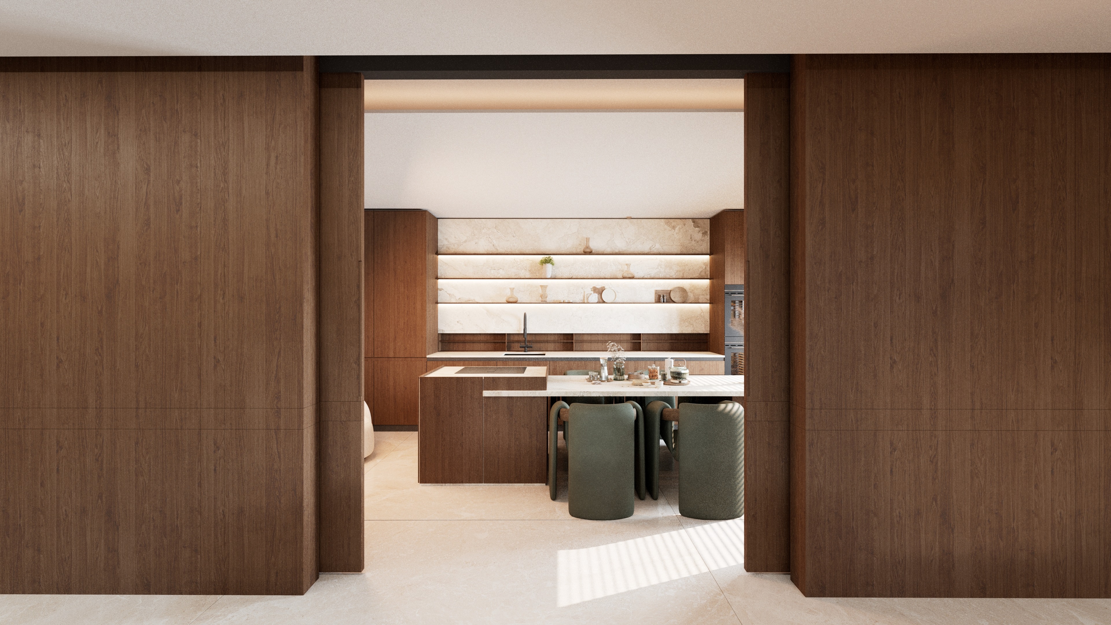 ultra realistic high end interior render of a modern minimalist kitchen preserve exact architecture layout proportions materials and camera angle do not modify design enhance realism to pinterest level quality use physically accurate lighting with soft global illumination and natural light coming from the right side as in original add subtle sun shadows with realistic direction and softness improve material definition dark walnut wood panels rich grain slight variation matte satin finish premium seamless texture stone surfaces backsplash shelves soft beige travertine marble look with fine veins and micro imperfections floor clean large format tiles with subtle reflection and natural roughness variation refine details perfect edge bevels and micro imperfections no sharp cg edges add realistic reflections on surfaces especially countertop and floor improve depth with slight ambient occlusion in corners and joints styling keep minimal and premium do not clutter add a few high end accessories on shelves ceramic vases small decor objects one plant on island elegant setup with glassware tray and subtle kitchen items keep composition clean and balanced lighting warm integrated led strips under shelves soft diffused glow cinematic contrast soft highlights controlled shadows no overexposure no artificial glow camera render maintain original framing slight depth of field very subtle background gently softened photorealistic rendering high dynamic range sharp but natural final look luxury warm editorial interior like high end pinterest architectural magazine render no cgi feel