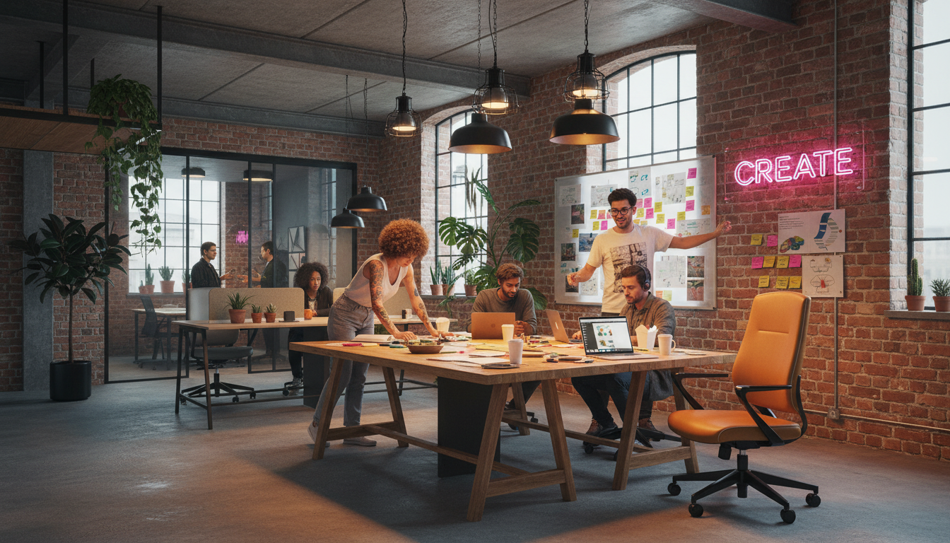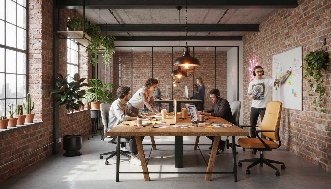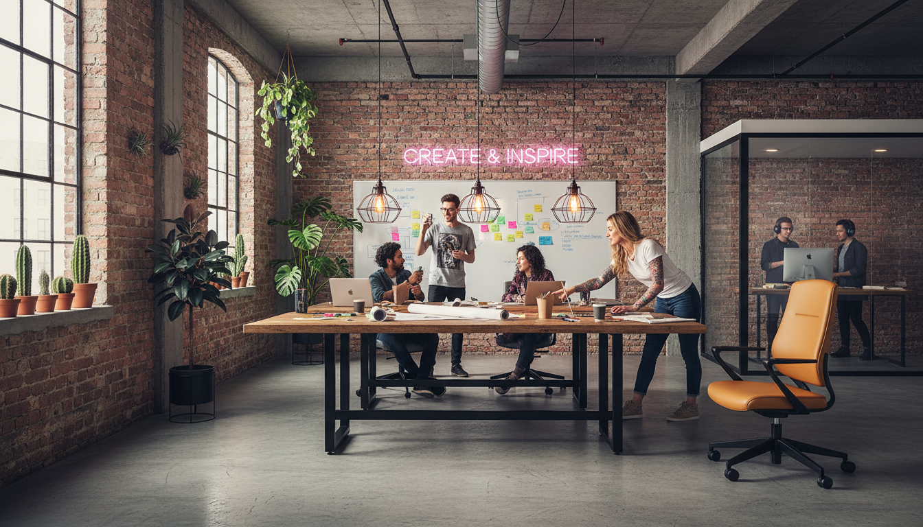 luxury creative meeting room editorial photography hero camel tweed fabric office chair positioned at head of oval meeting table foreground chair fully rendered sharp and elegant background scene sophisticated art forward meeting space curved oval white oak table organic edge warm grain six designer chairs around table in mix of dusty sage green and warm terracotta upholstery feature wall large scale abstract art canvas sweeping ochre dusty rose warm terracotta brushstrokes like oversized cy twombly painting floating oak credenza against wall ceramic objects art books trailing plant circular brushed brass pendant light above table people creative presentation in progress young female creative presenting from ipad animated expression colorful blazer natural confidence standing beside projection screen four attendees around table senior man leaning forward with interest hands clasped woman making notes in leather journal young man in turtleneck casually engaged another checking phone briefly natural office behavior coffee cups and water glasses at each place setting plants large lush areca palm in oversized matte terracotta planter back corner feathery fronds arching gracefully trailing string of pearls from credenza edge small pilea and peperomia cluster on table tall sculptural euphorbia beside art canvas hanging macram plant holder with trailing pothos ceiling lighting warm brass pendant casting golden ring of light on oval table surface natural daylight from clerestory windows above art canvas wall catching directional warm spotlight camel chair upholstery glowing warm honey people naturally lit no harsh studio feel color palette warm oak ochre art canvas dusty sage terracotta warm camel hero chair brass gold accents style azure magazine design studio dezeen creative workplace photography 8k ultra hd art forward and human warmth ar 16 9 style raw stylize 250 q 2