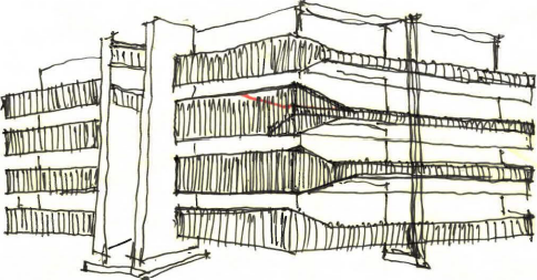 modern rectilinear apartment building with straight floor slabs continuous wavy balcony parapet wrapping around corners smooth flowing top edge only consistent sinusoidal curve across all floors clean white facade with dark balcony bands minimal structure elegant and restrained wave expression photorealistic