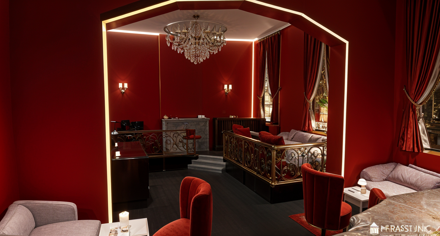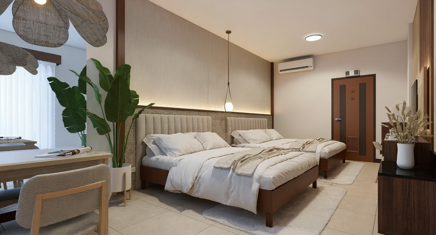 perspective shot exposed brick walls as the dominant enclosure material creating a warm textured backdrop a polished concrete floor with a subtle sheen adding a raw industrial feel a 7 meter high timber ceiling constructed with a coffered or slatted design to emphasize rhythm warmth and verticality a wooden mezzanine level inserted at 3 4 meters height cutting through the volume to create intimacy while preserving the double height space near the entrance a sculptural spiral staircase located in the front double height zone with a modern lightweight design and perforated or mesh railing the staircase should connect to the edge of the mezzanine