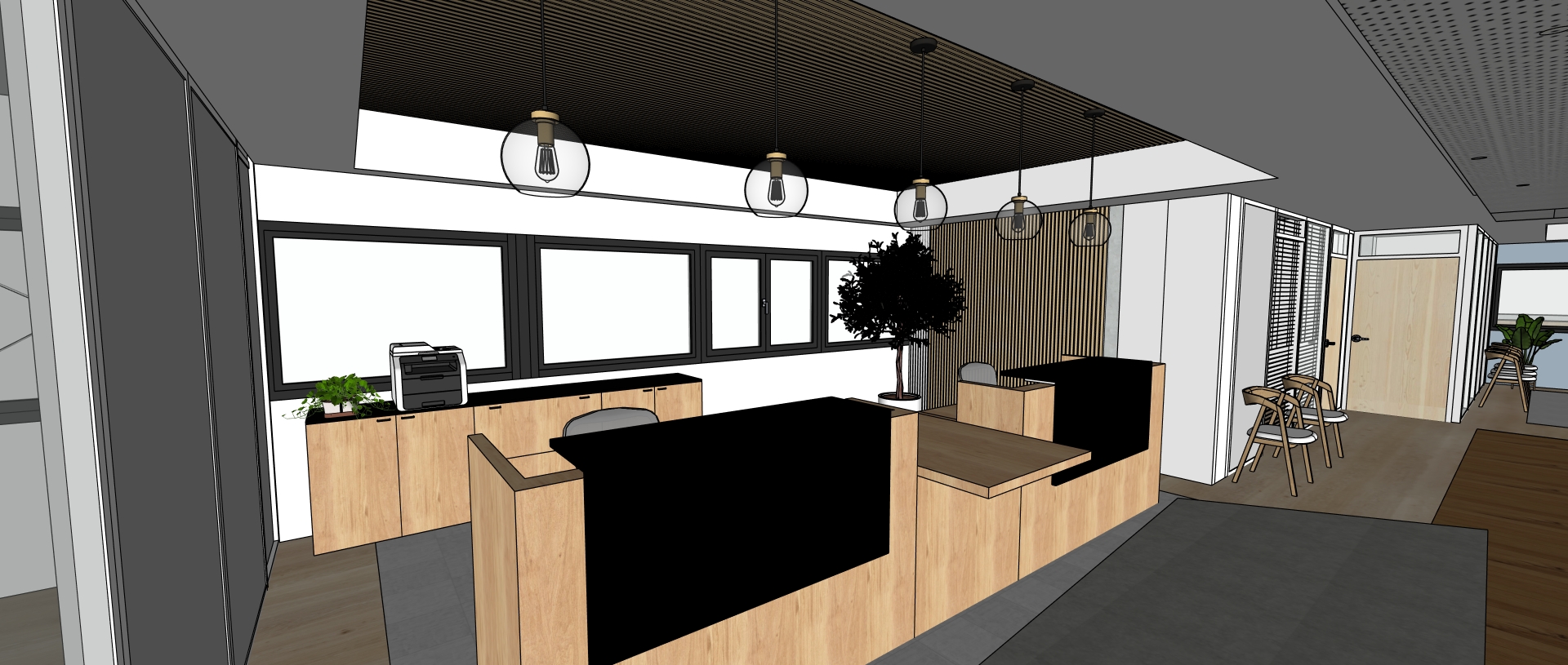 le sol est en vinyl la pi ce se situe au 1er tage la vue donne sur des arbres et des batiments bas les suspensions sont allum es sur la droite les stores sont ferm s la table basse est blanche claircir le plafond lattes de bois en ch ne moyen les murs sont gris poudr le banc est en bois et tissu cru les trois suspensions sont allum es la lumi re naturelle rentre doucement dans la pi ce les menuiseries des fenetres sont noires