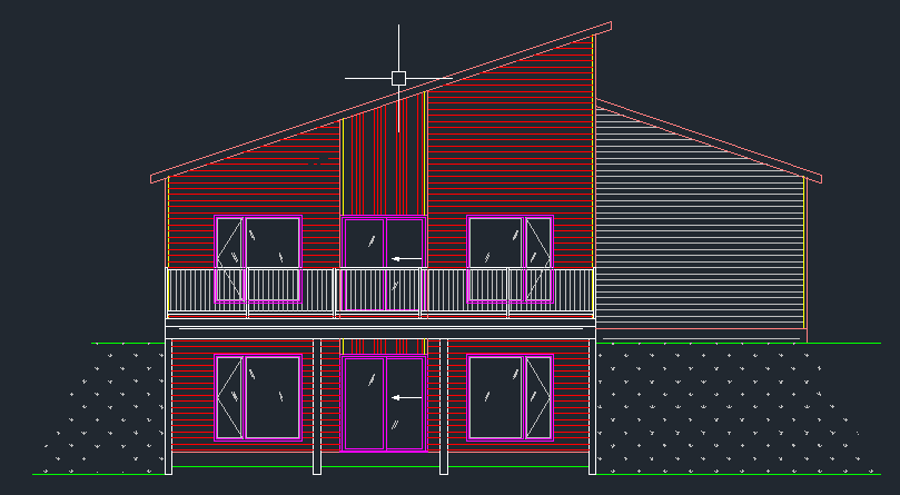 all windows are black for modern look the roof is a black steel roof the horizontal siding its a withe vinyle the vertical siding is a black board and batten all facia and soffit are black the patio is in treated wood the structural frame is capped with black aluminium with 42 railling the land is walk out type from back to front house in a forest