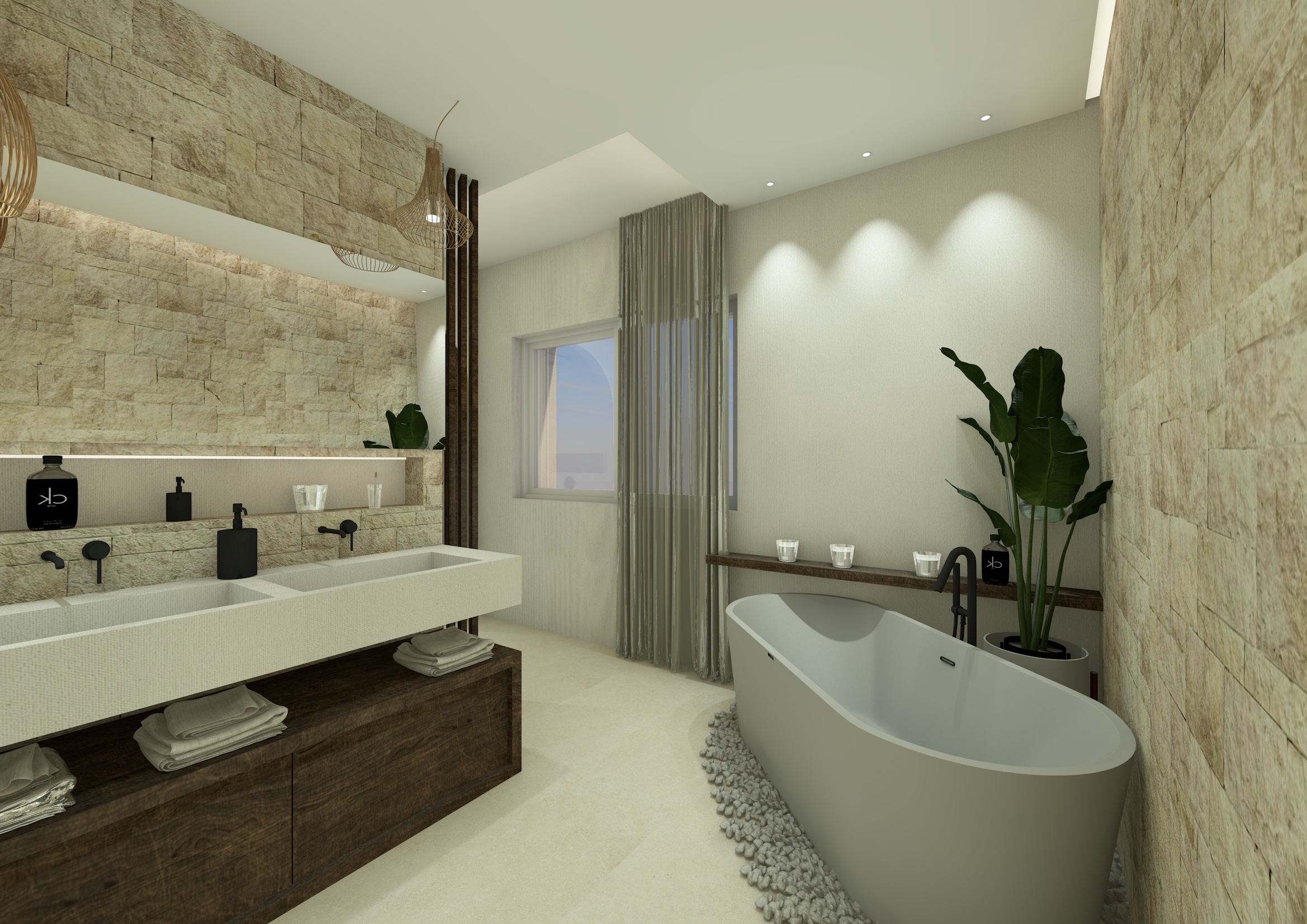 create a serene modern bathroom with a natural stone aesthetic complemented by a light cream floor incorporate a double sink with a sleek off white countertop and a dark wood cabinet below design a freestanding matte gray bathtub surrounded by smooth river stones adding a natural element include a large leafy green plant beside the tub for a fresh look position a horizontal wooden shelf with candle holders above the bathtub and a window with sheer gray curtains allowing soft natural light use black fixtures for a modern contrast and incorporate warm ambient lighting to enhance the cozy tranquil atmosphere