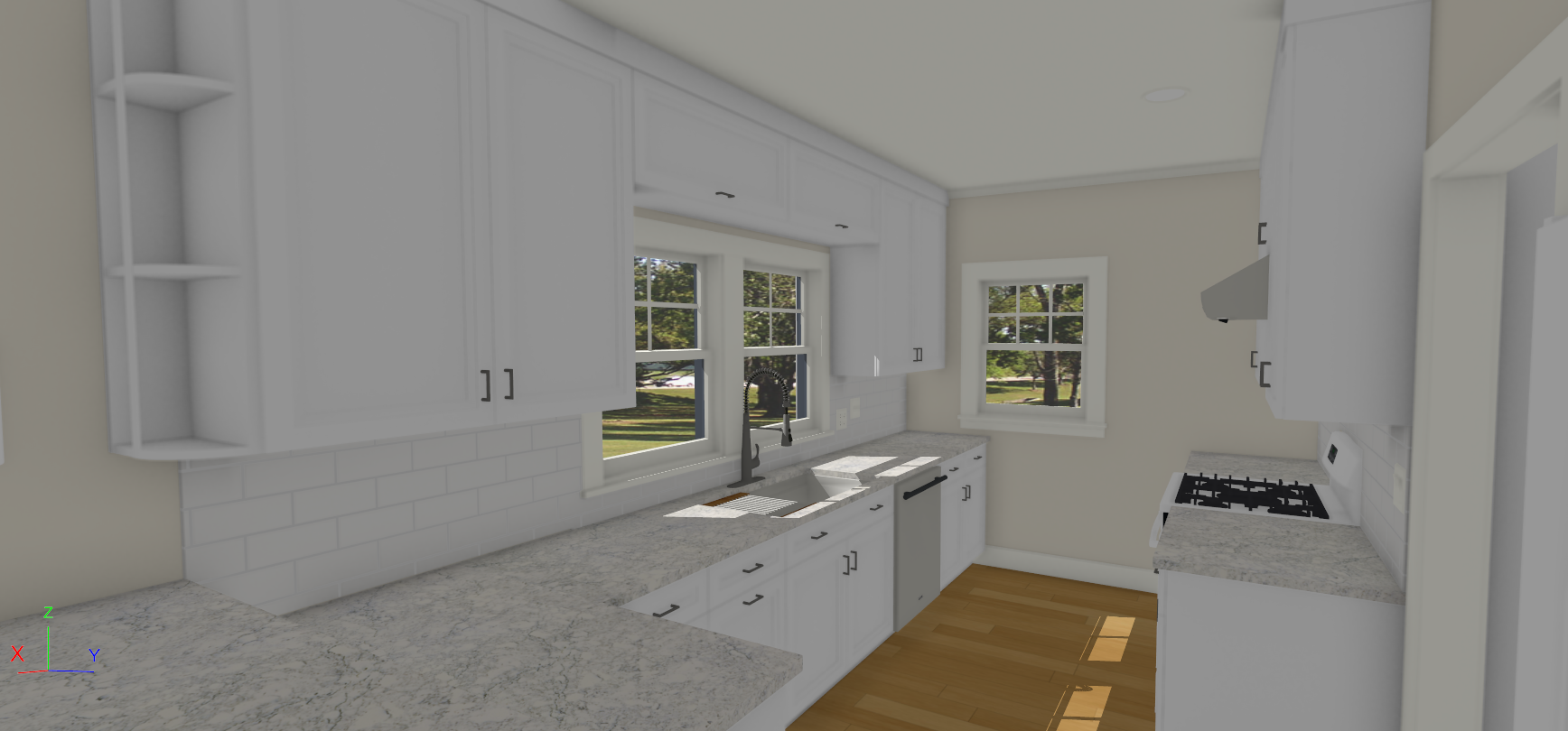 render a bright and inviting kitchen with large windows use a soft cream color for the walls to create warmth the cabinets should be a crisp white accentuated with sleek black handles choose a light gray marble texture for the countertops with subtle white veining the backsplash should feature glossy white subway tiles integrate stainless steel appliances for a modern touch install natural oak wood flooring to add warmth and texture ensure natural sunlight floods the room casting gentle shadows for a cozy and welcoming atmosphere
