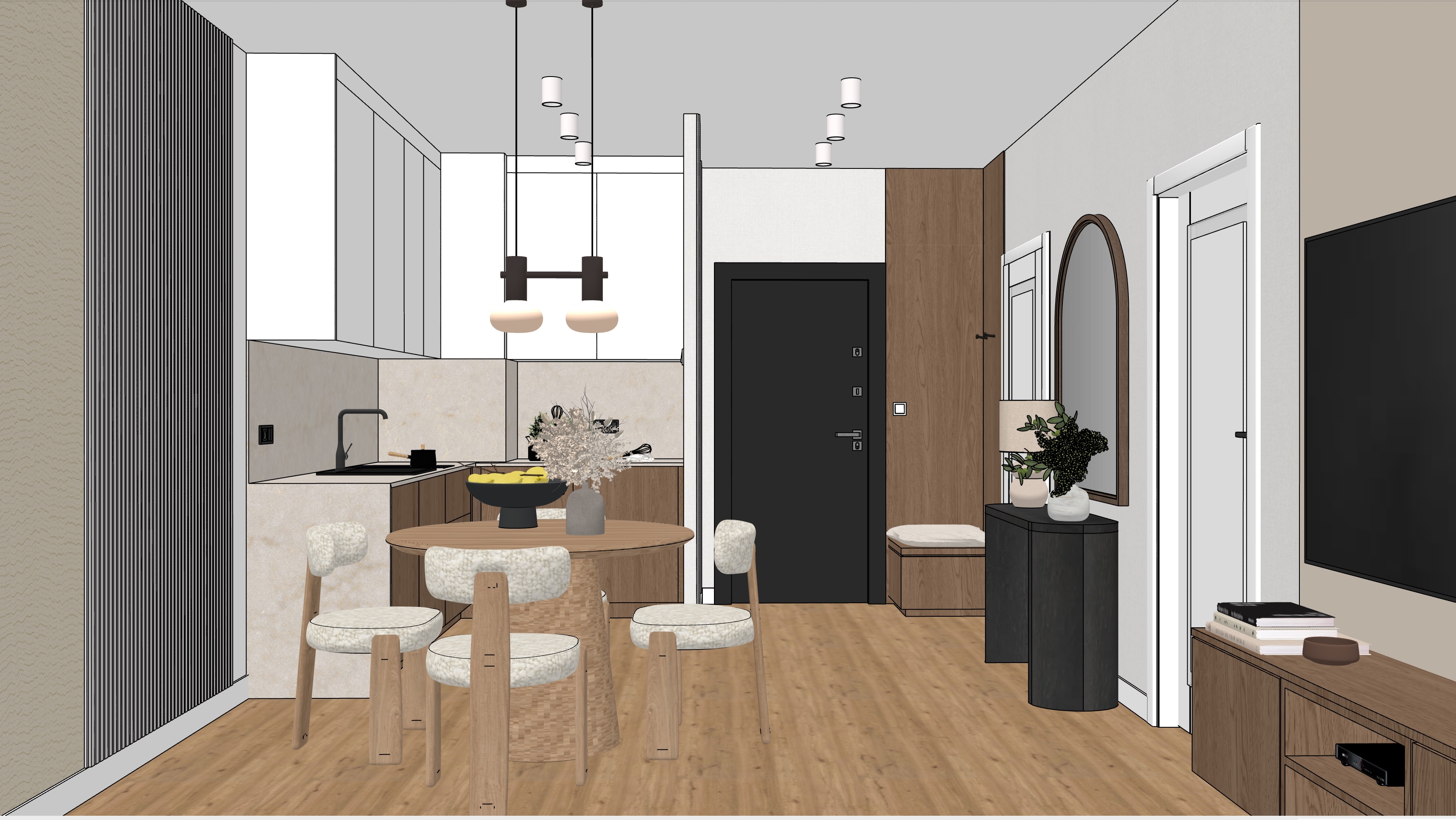 ultra photorealistic interior visualization of a kitchen and dining room designed for a real estate sales presentation the space should feel bright elegant and highly desirable styled in warm and natural tones such as beige ivory sand taupe and warm wood contemporary yet timeless aesthetic soft natural light minimal but refined decor realistic wood textures stone or quartz countertops modern cabinetry stylish pendant lighting above the dining table inviting dining setup subtle accessories premium materials balanced composition clean and spacious look luxury property marketing style realistic proportions depth soft shadows highly detailed 4k render