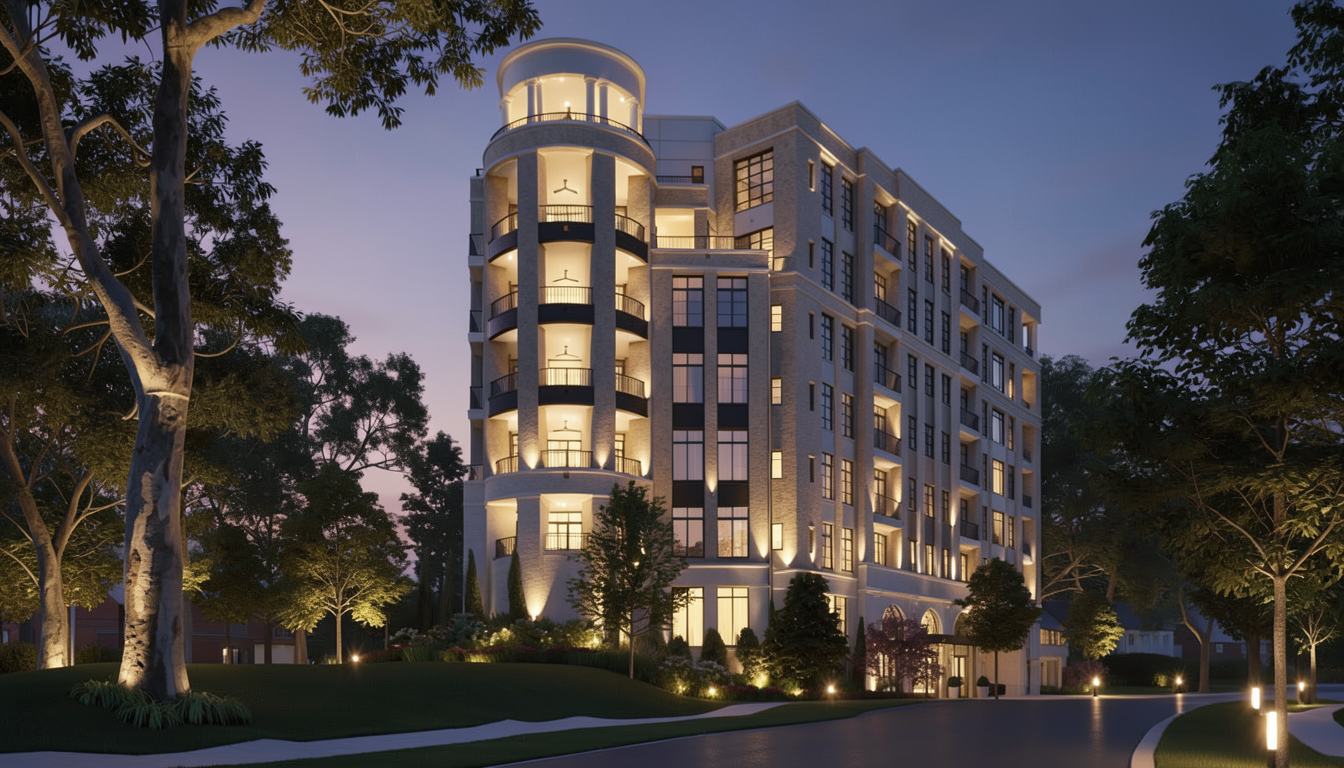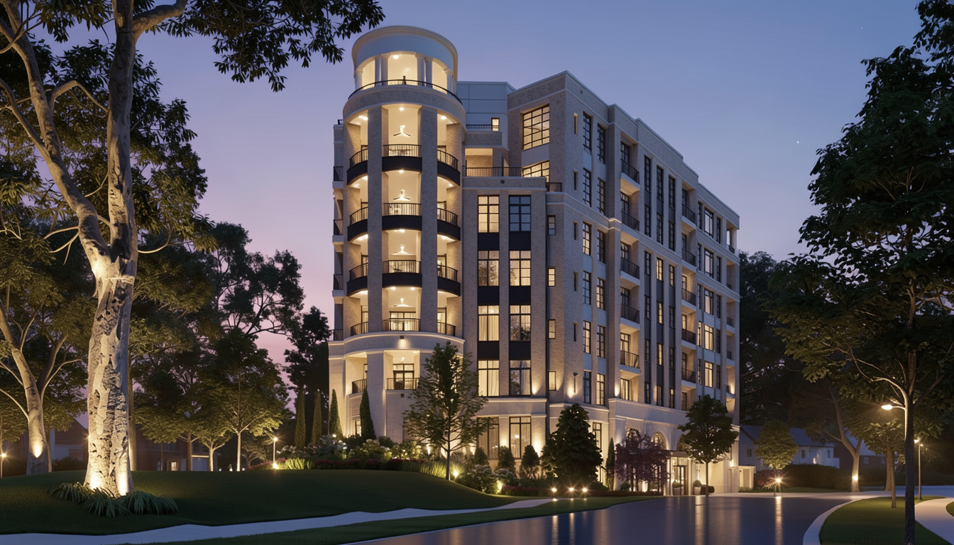 active high end luxury building enhance materials twighlight soft dusk gradient sky uplights in trees maintain materials