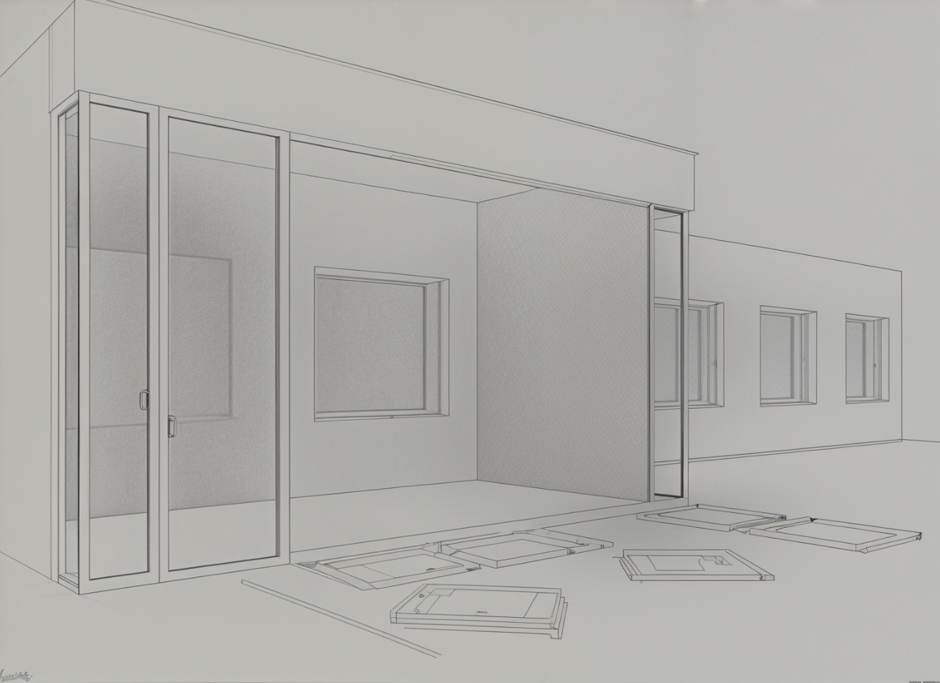 transform this rough interior concept sketch into a polished photorealistic render use the layout as a guide but take creative liberty with the materials lighting and fine details to create a stunning final image add furniture on the first plane sofa and two chairs behind the translucent wall make a meeting room with table and office chairs put curtains behind the glass wall put there two acoustic booths on the right side of the picture