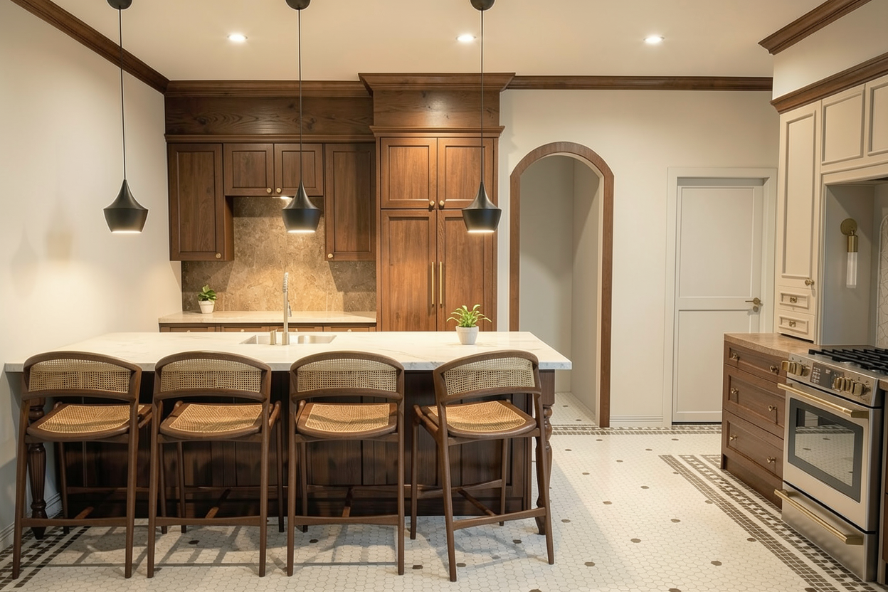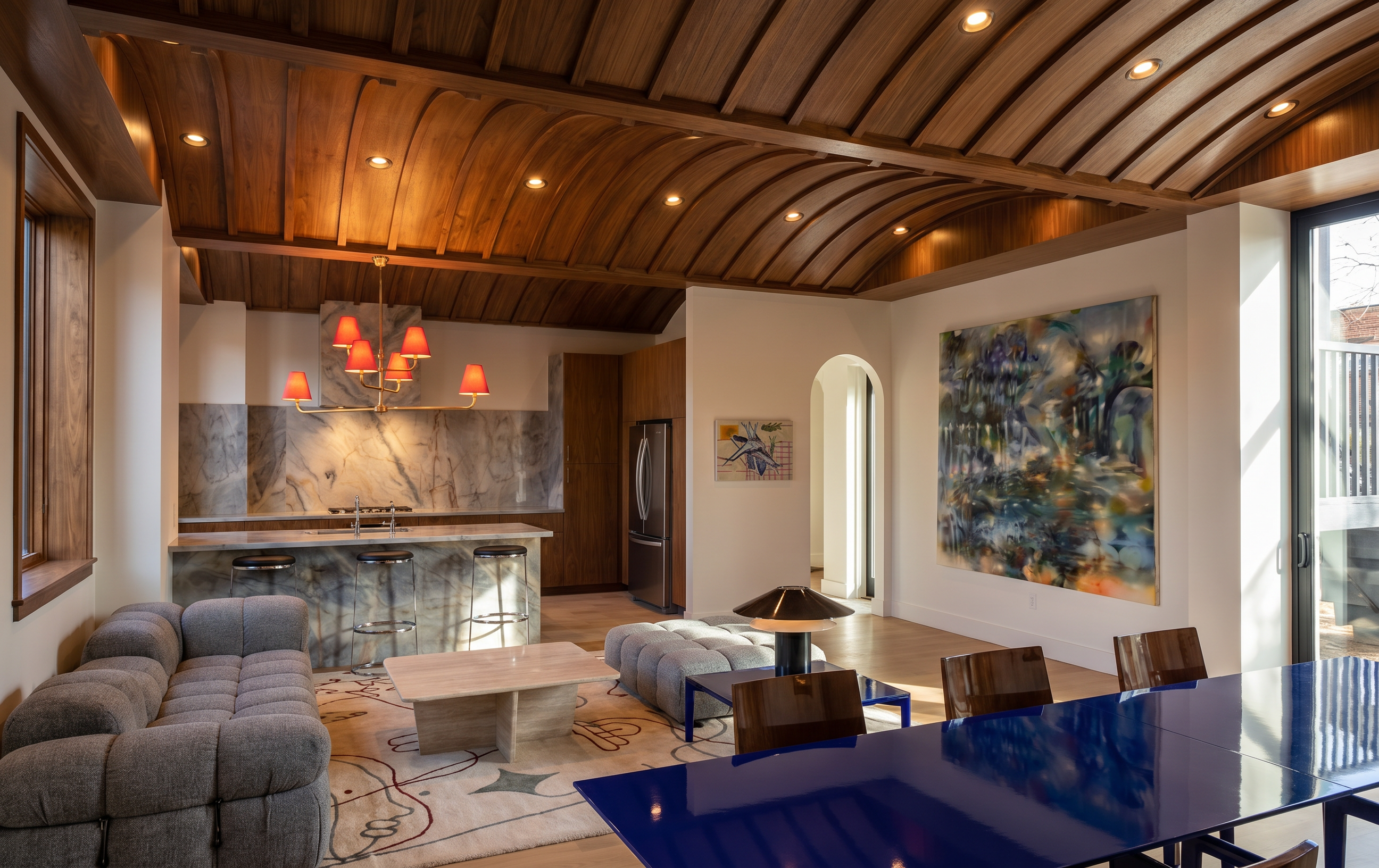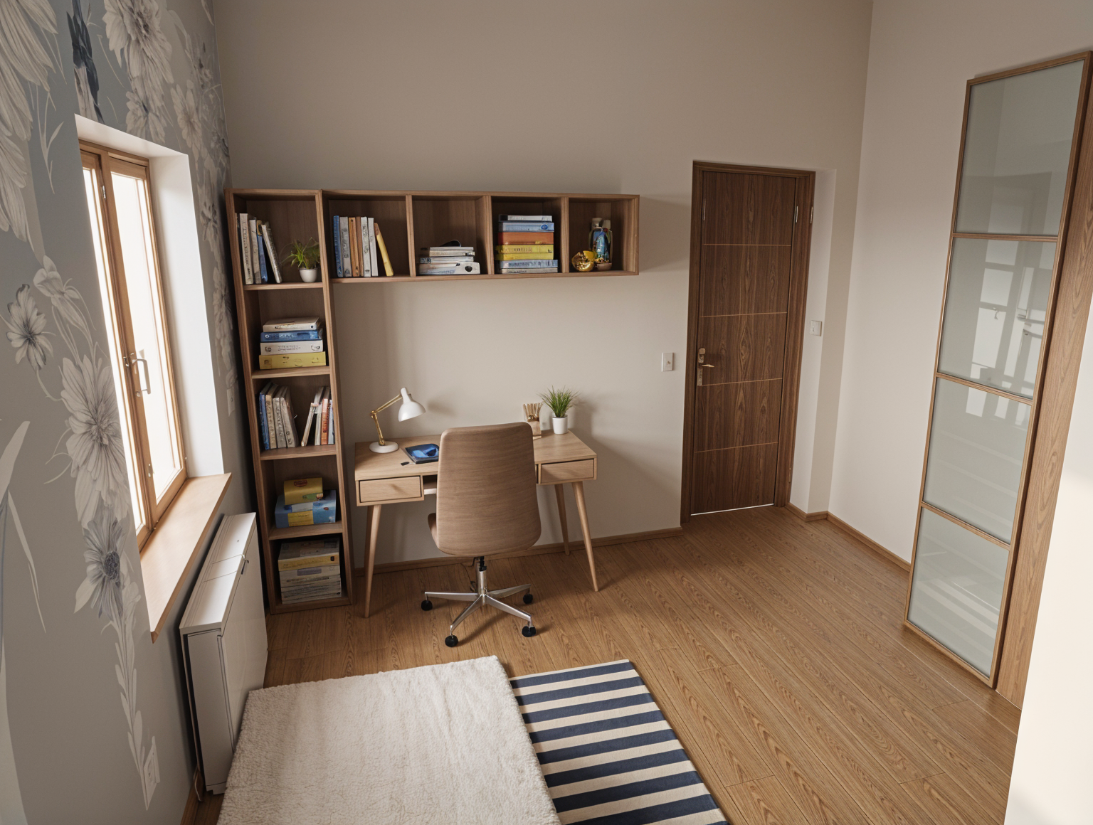 render a luxurious modern office interior with a minimalist design use soft beige and cream for the walls and ceiling complemented by natural wooden textures for panels and shelves incorporate sleek contemporary furniture in light gray tones with leather accents add large expansive windows with sheer curtains letting in abundant natural light for a warm and inviting atmosphere include subtle green elements with potted plants to add vibrancy the lighting should be a mix of recessed warm led lights that create a sophisticated ambiance the overall atmosphere should be calm and elegant exuding a sense of professionalism and style create several sepperate offices with glass walls