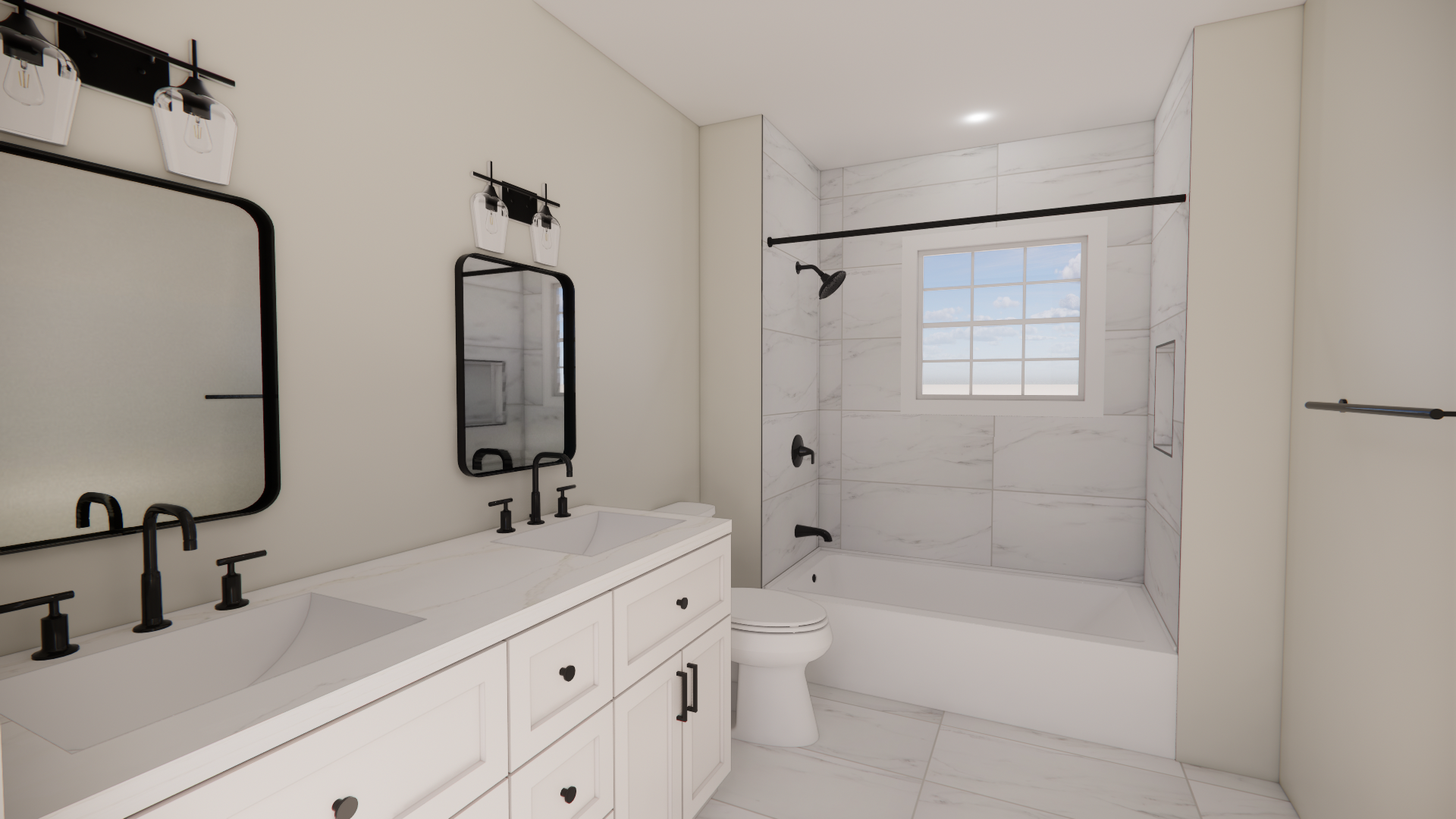 keep all materials layout and colors the same make this a photo realistic rendering make the lights look realistic and 3d and make them light outside the window juts put trees keep wall color the same and keep black schluter at the end of shower tile walls