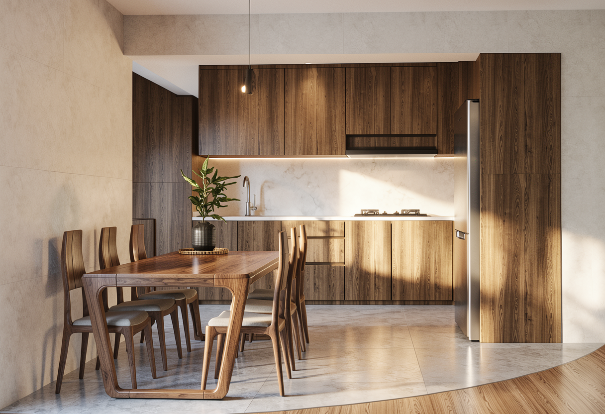 this is an interior view of a coffee shop the ordering counter has tile on its facade and the furniture is oak and jade green powder coated metal the left of the room has a small area of yellow shelving in the center of the image a rectangular storage cabinet is shown next to a refrigerator with glass doors the refrigerator has drinks for customers in it the center of the image has globe lights that have a soft glow the space has soft natural light in it but do not render any surfaces as windows there are no windows in the view the tabletops are thin laminate in a deep coral color