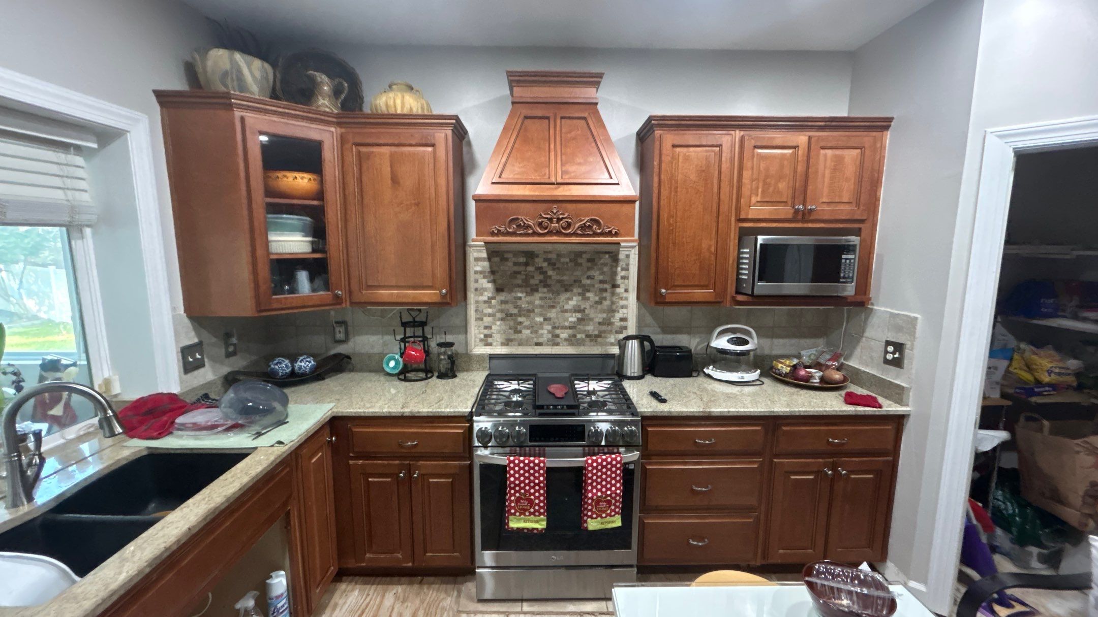 remove teh chair in the foreground and the cabinet and countertop in the bottom right corner