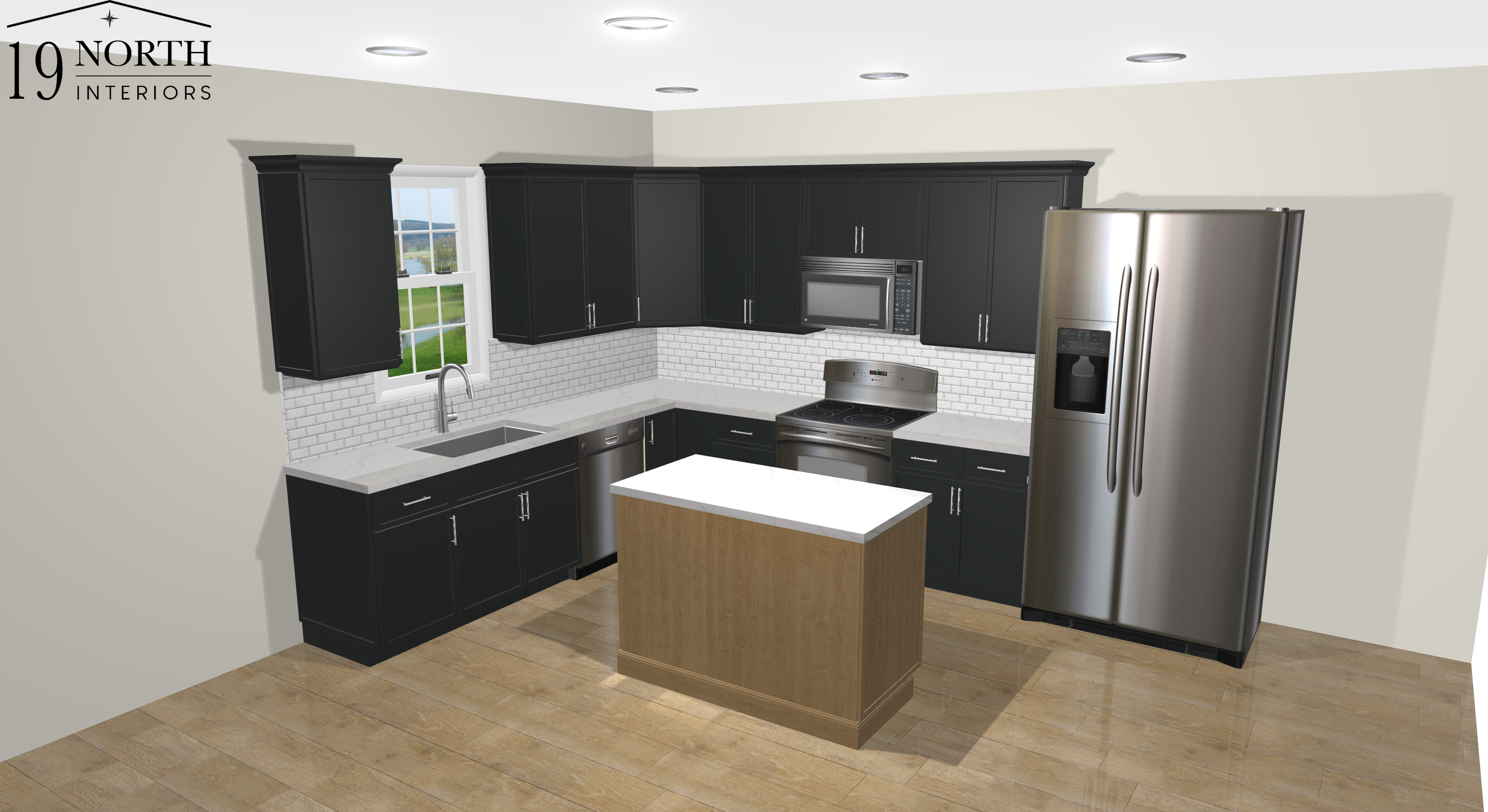 photorealistic interior rendering of a kitchen the perimeter cabinets are a dark grey skinny shaker the island is a natural stain