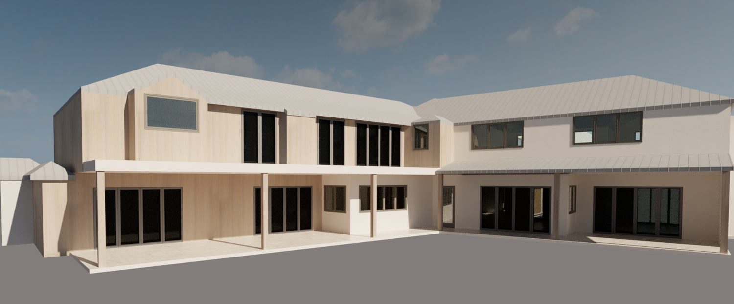 make a photorealistic image the ivory area is smooth eggshell stucco and the timber is a light washed white oak wood plank installed vertically the window and door frames are dark anodized bronze and the roof is a silver aluminum standing seam roof make a blue sunny sky with a few clouds give soft shadows for dimension add a grassy backyard and a rectangular pool oriented left to right or east to west add four lounge chairs next to the pool add a few scattered mediterranean style plants around the perimeter