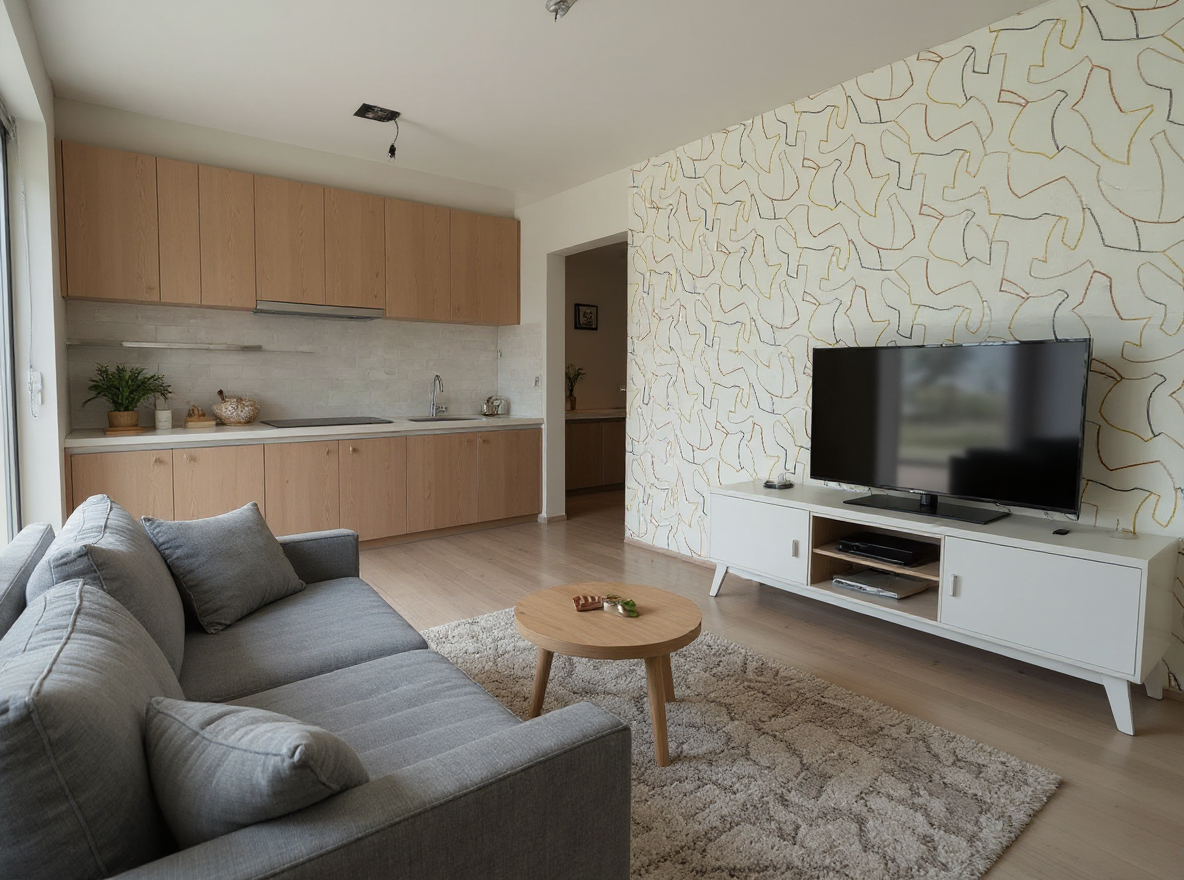 render a minimalistic modern room with smooth light wood flooring and an abstract patterned wall the wall features a cream base with intricate flowing lines in soft rust red deep gray and muted gold ceiling is painted off white enhancing the room s airy ambiance natural light streams through the windows creating soft shadows add delicate minimalist light fixtures hanging from the ceiling enhancing the serene and contemporary atmosphere the overall vibe is calm inviting and stylishly modern architecture
