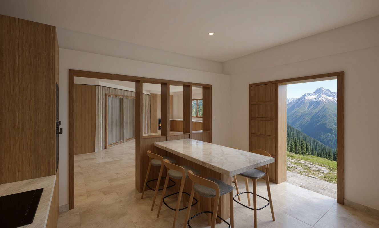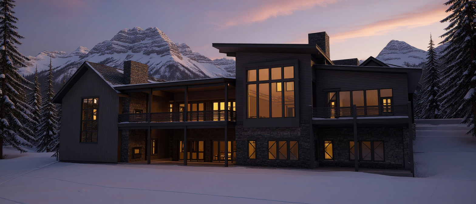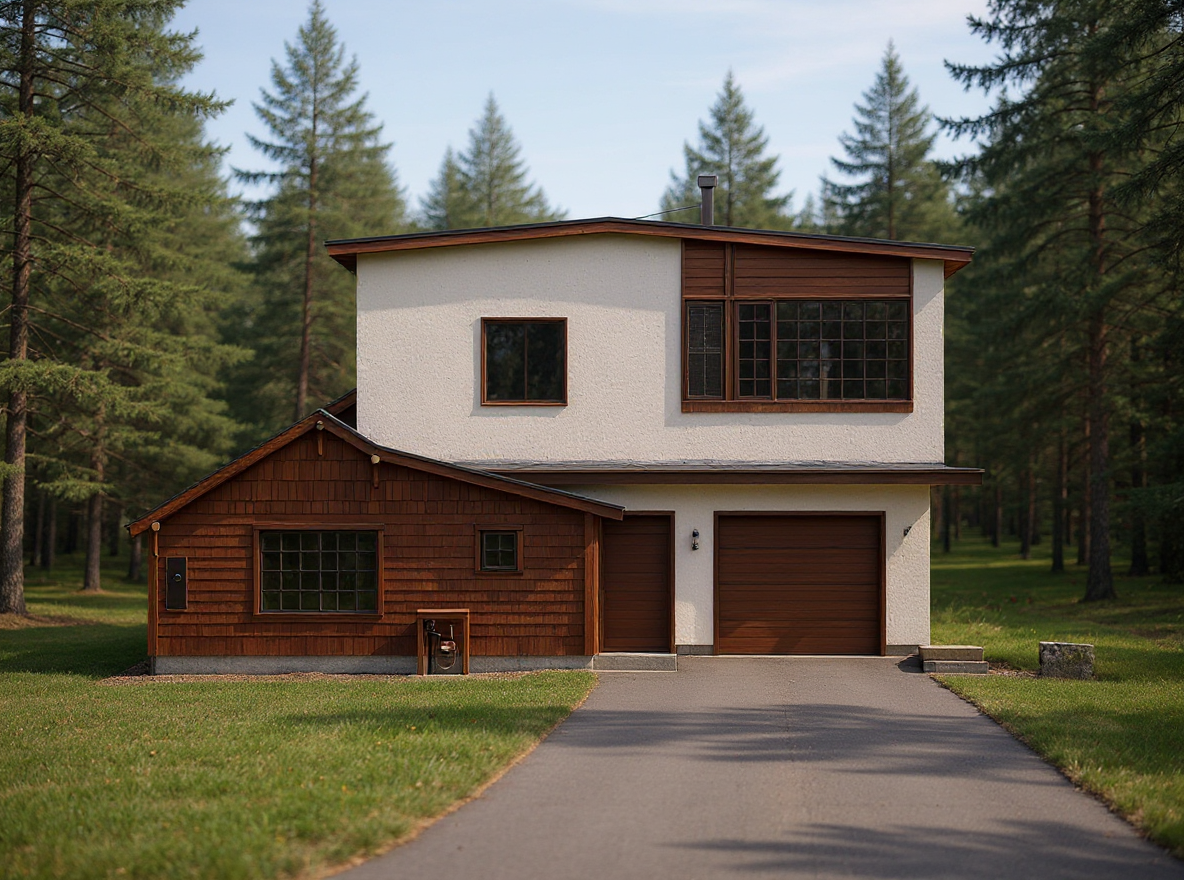 this elevation should have two different wood finishes the yellow shaded areas are to be light colored buckhorn cedar siding the green shaded portion is to be redwood siding and shakes all of the windows should have dark bronze frames and the rest should be white stucco also show a driveway leading to the garage door and put fir trees in the background