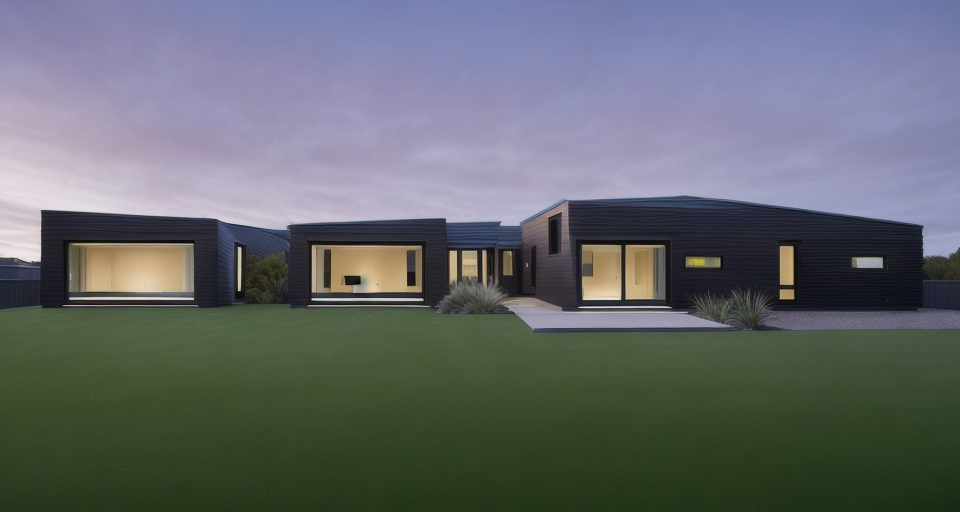 black board and batten cladding black roof black window frames low timber decks lawn extensive native plants trees in background sunset interior lights on