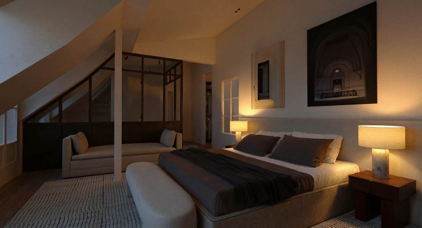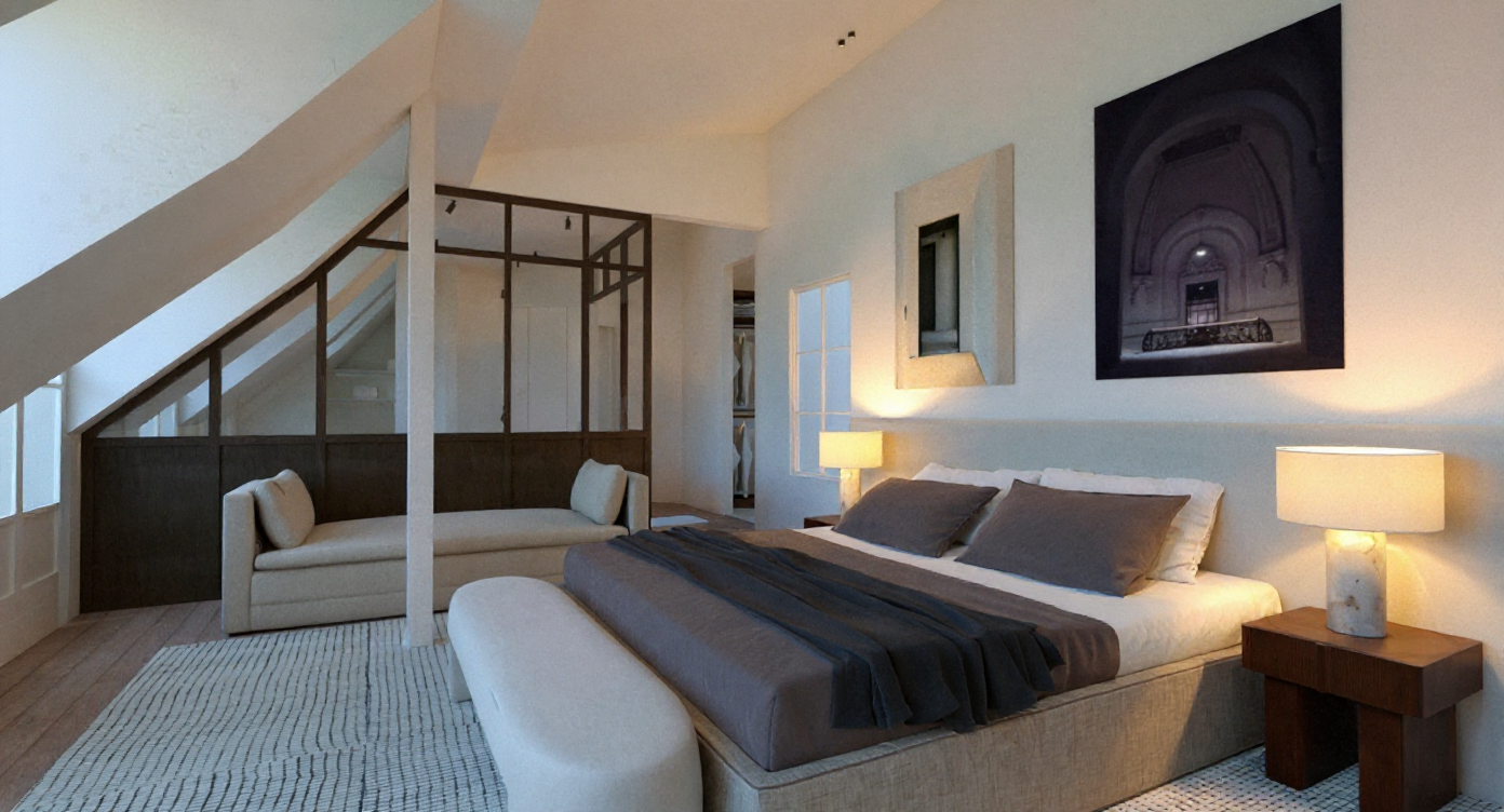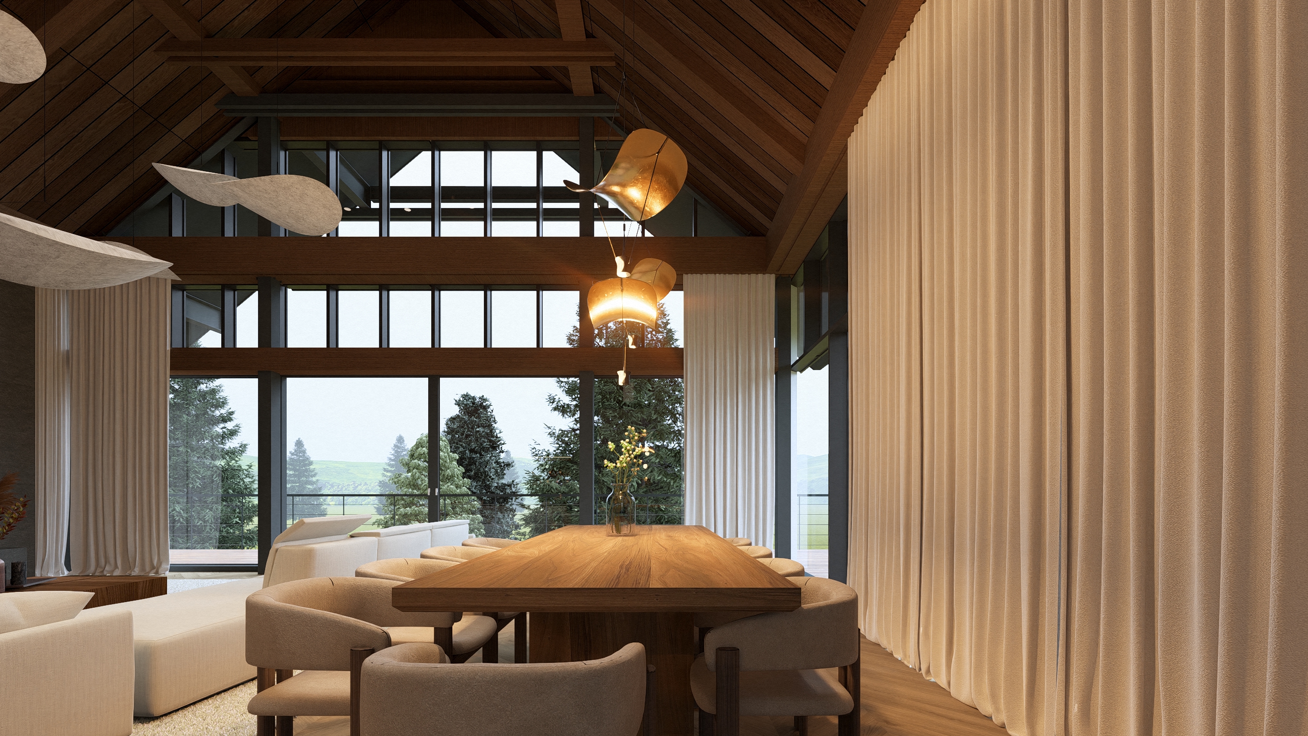 replace table and chairs with different types wooden table with natural oak wood planks matte finish replace chairs for wooden comfy dining armchairs add tableware for each seat as for a dinner