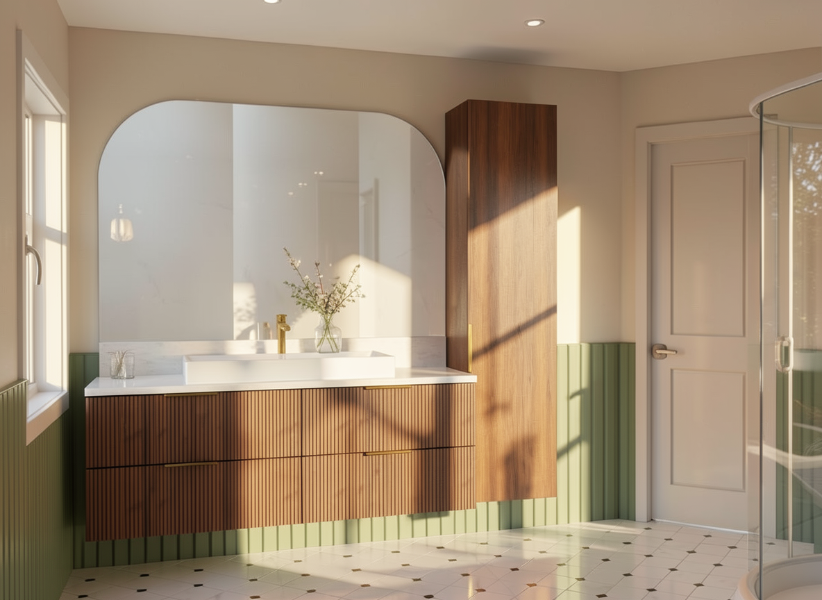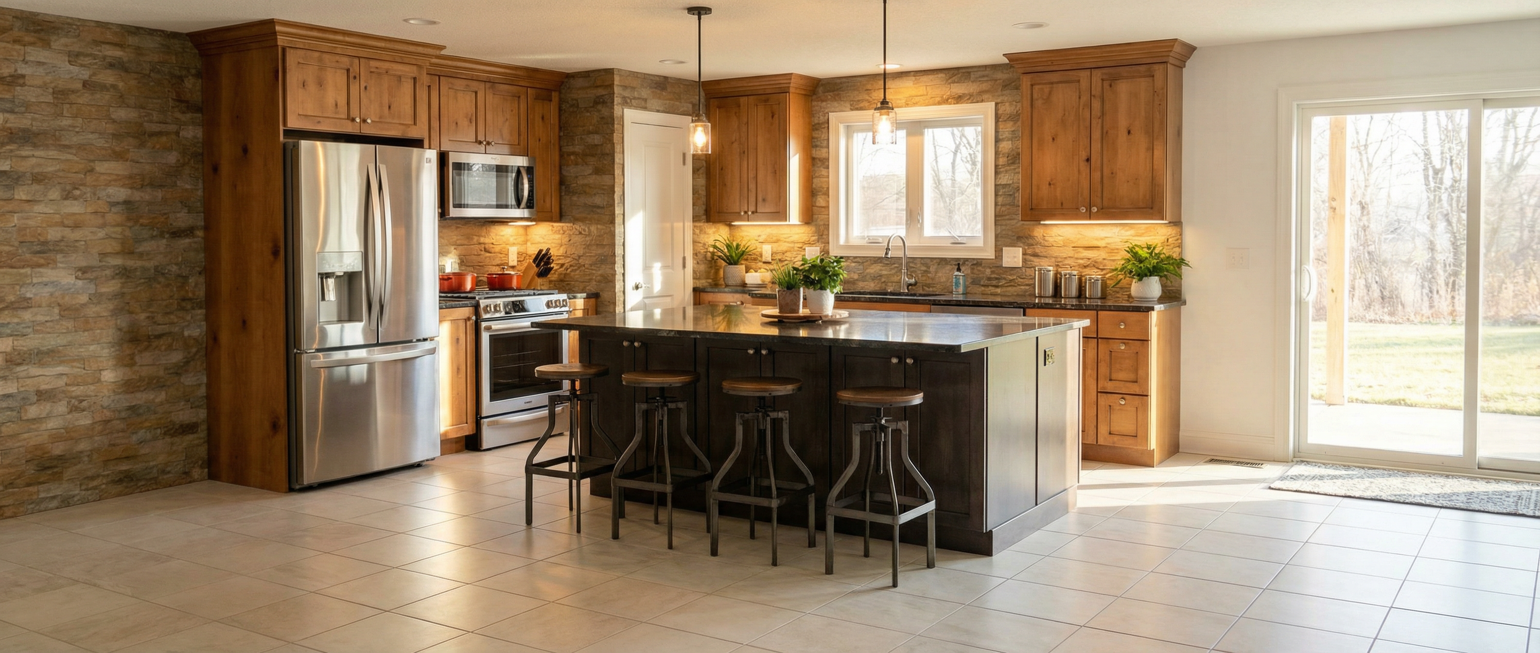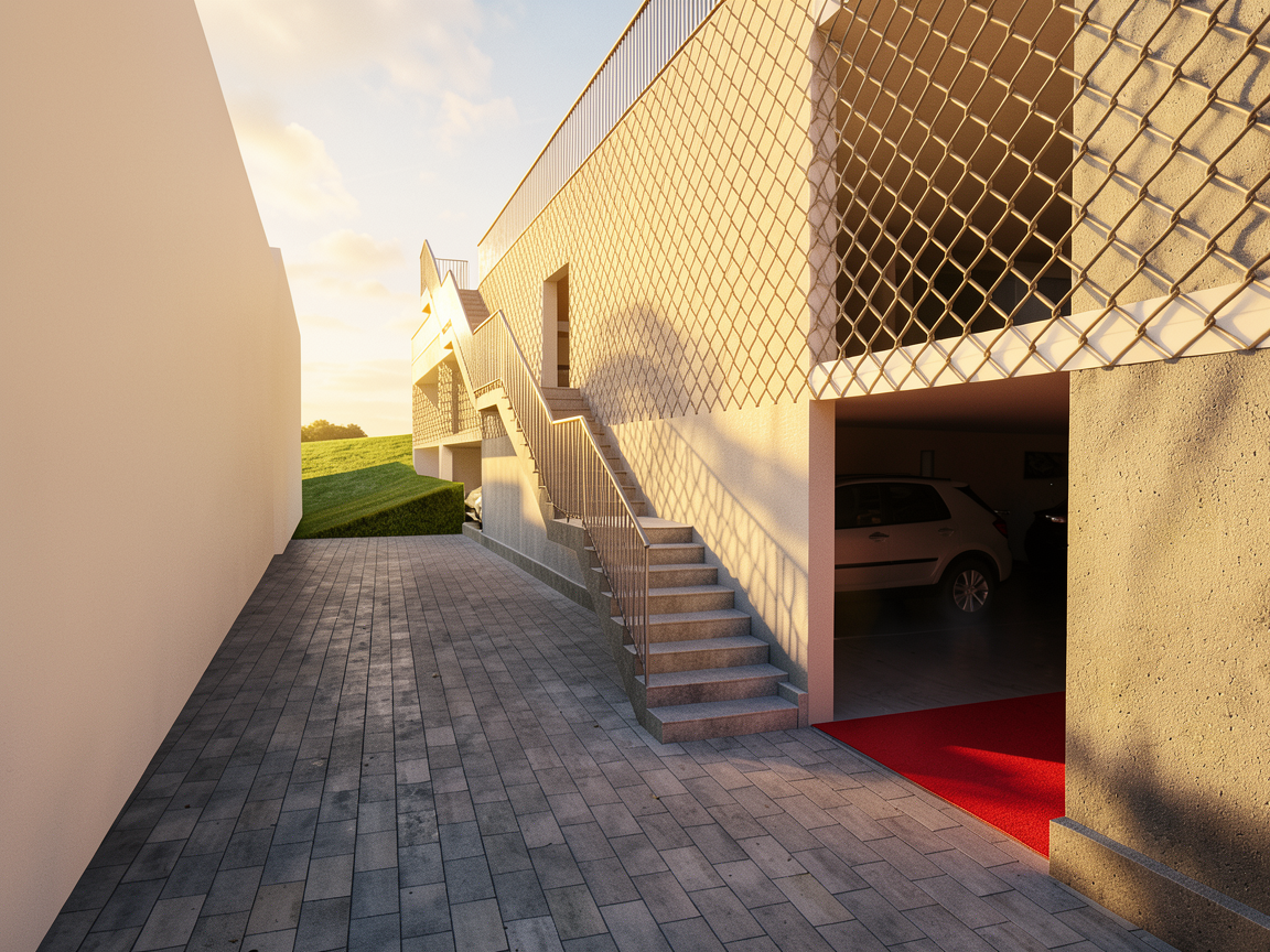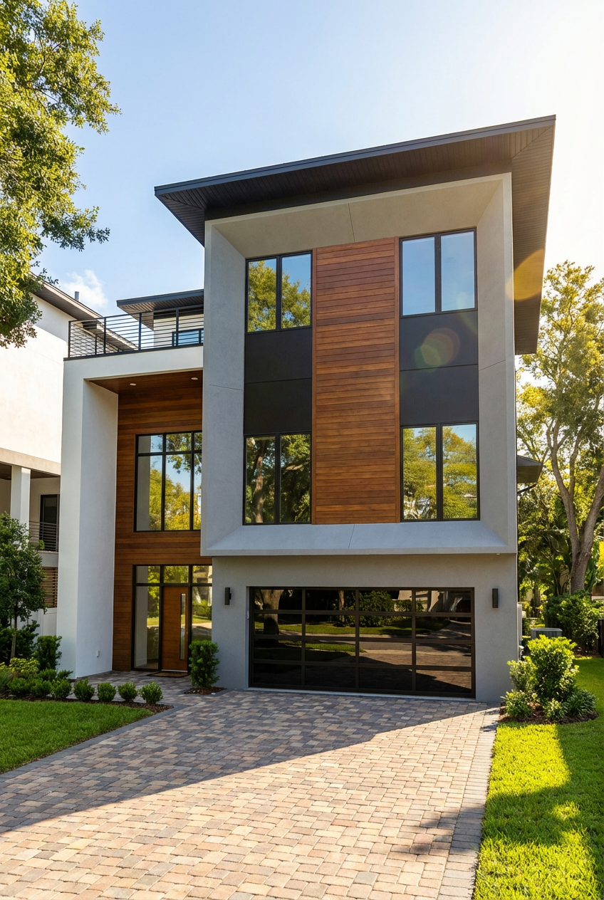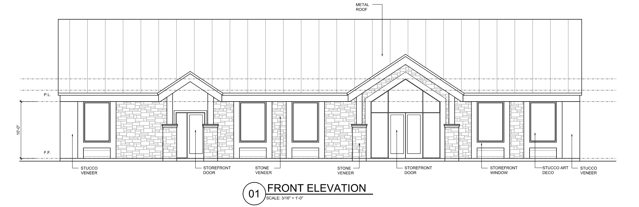 revised rendering create a photorealistic architectural rendering of a single story modern amenity center based on the provided front elevation overall style clean modernist architecture with subtle traditional gable elements symmetrical composition with strong material contrast primary material dominant the main fa ade is oklahoma blue stone veneer 70 azul 30 hazelnut mix stone should feature a mix of rectangular and square cuts with natural color variation depth and realistic mortar joints this stone is the primary visual driver across the entire front elevation accent material feature walls window wall sections are clad in dark blue cedar toned panels deep navy with subtle wood grain texture these panels frame and emphasize the storefront windows creating contrast against the stone secondary material minimal use stucco veneer fiber cement siding is used only on the outer side portions of the building not across the main fa ade color soft warm white light neutral tone keep application minimal and clean roof dark charcoal standing seam metal roof with realistic seams and slight reflectivity windows doors large storefront glass windows and doors with dark framing glass should be slightly reflective with subtle environmental reflections architectural details highlight the central entry gable and secondary gable elements include depth at columns trim and entry recesses for realism landscaping site simple clean landscaping under windows ornamental grasses low shrubs minimal planting beds straight concrete sidewalk paths leading directly to each entrance design should feel modern organized and low maintenance environment place a small lake behind the building visible but subtle add a few natural trees and soft greenery to frame the scene lighting use warm late afternoon golden hour lighting for soft shadows and depth ensure realistic material textures reflections and contrast camera straight on frontal view at eye level slightly wide lens to capture full building quality ultra realistic architectural visualization highly detailed 4k quality