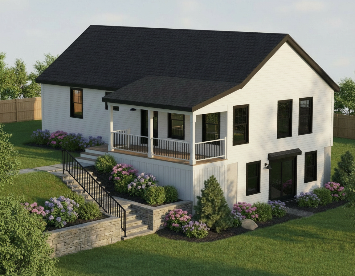 render but change the furniture and light to the reference images ceiling is vaulted shiplap with 1 center beam countertop for bar is calacatta windows are 4 lite