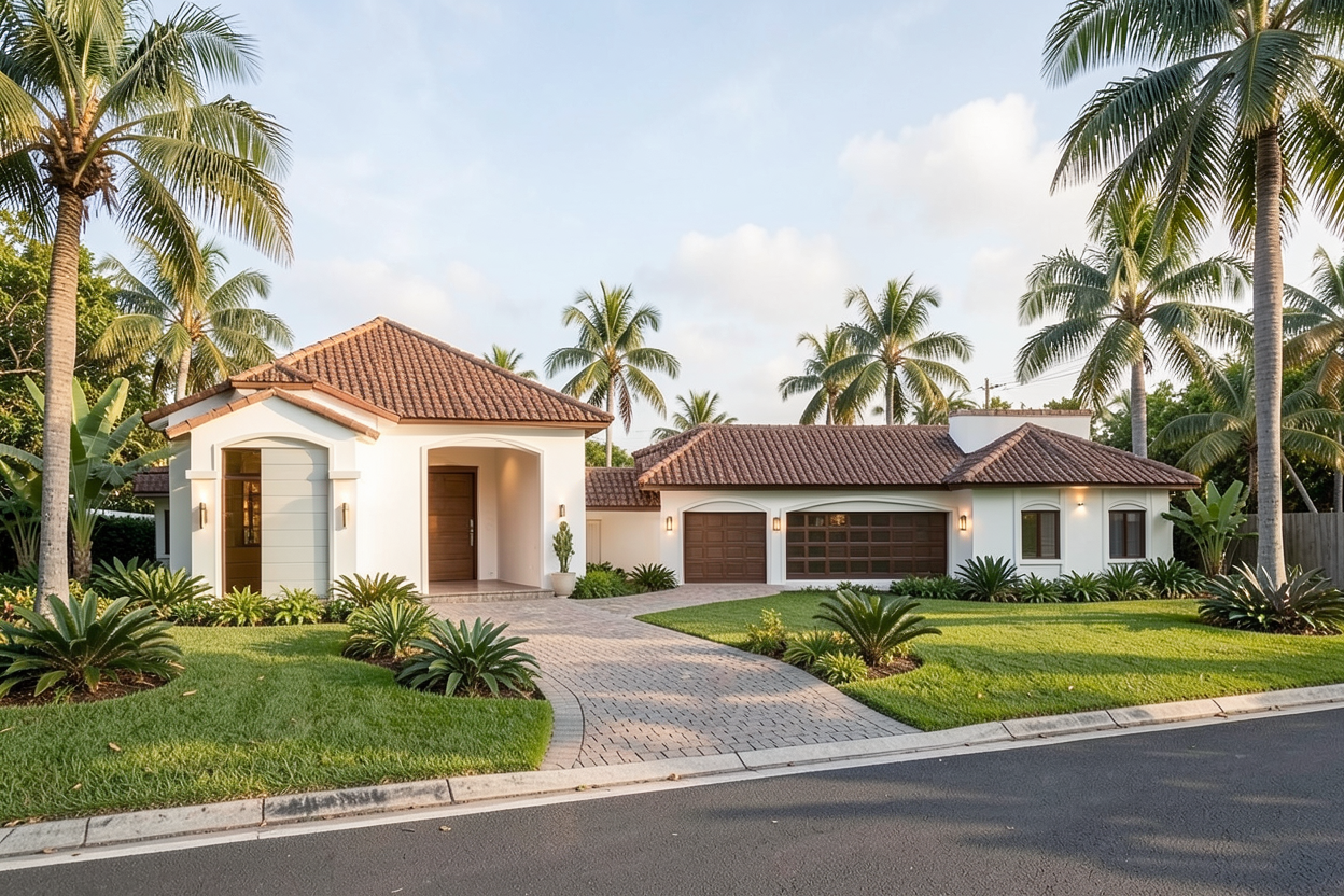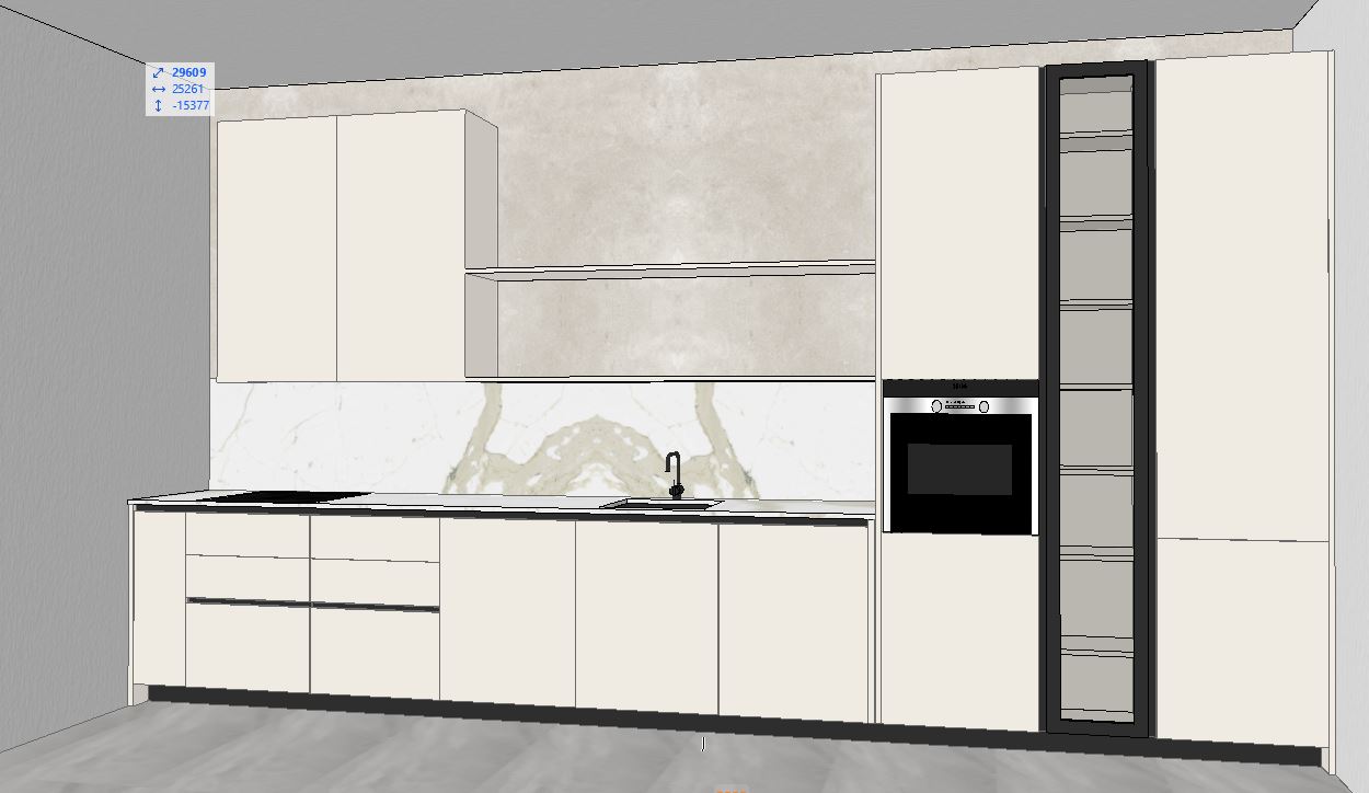 create a modern kitchen interior design with dark brown wooden cabinets and a sleek minimalist style use warm cream colors for the upper cabinets to create a soft contrast the backsplash should be a luxurious white marble with subtle beige veining the countertop is a smooth clean white include a modern black oven and a sleek black faucet enhancing the contemporary look design the room with soft ambient lighting to generate a cozy and inviting atmosphere