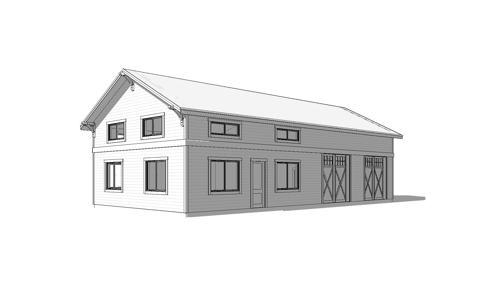 clean modern barndominium architectural exterior home rendered in cinematic vibrant golden hour lighting with blue skies and vibrant clouds barndominium in a lush beautiful forest setting with green grass and dense trees surrounding the property warm glow and reflections off of the windows select grade horizontal white hardie siding green manicured landscape around structure with gardens and grass black standing seam metal roof high fidelity photorealistic visualization crisp shadow falloff refined facade geometry soft atmospheric depth premium architectural photography mood ultra clean composition and materials photorealistic render black trim around the windows and doors prominent trees scattered around the property black window trim and posts concrete driveway leading to the black garage doors black man door white belly band