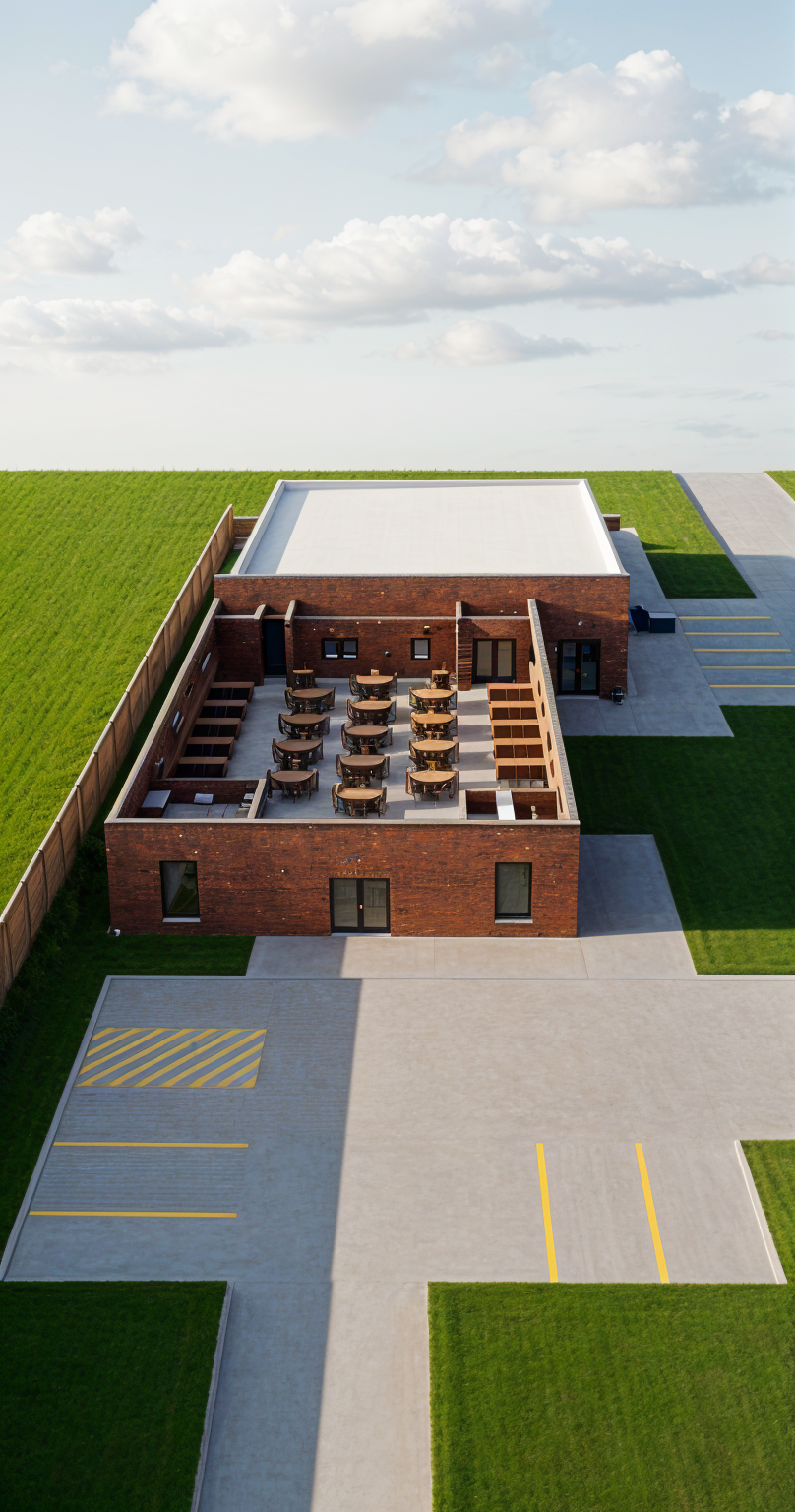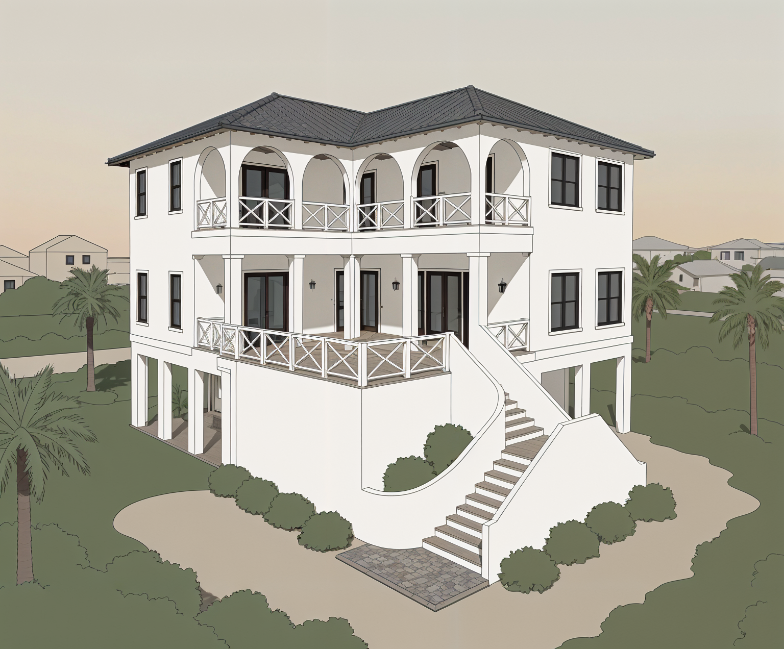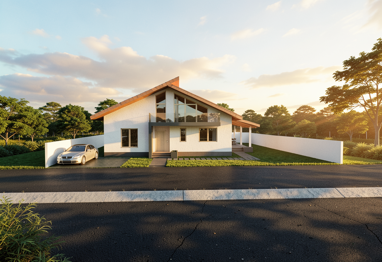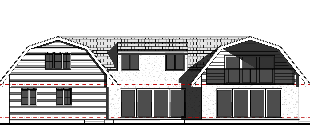 use a weathered yellow brick for the gable end and white render for the rest of the facing material fascias should be wooden add trees to the background sun is top right