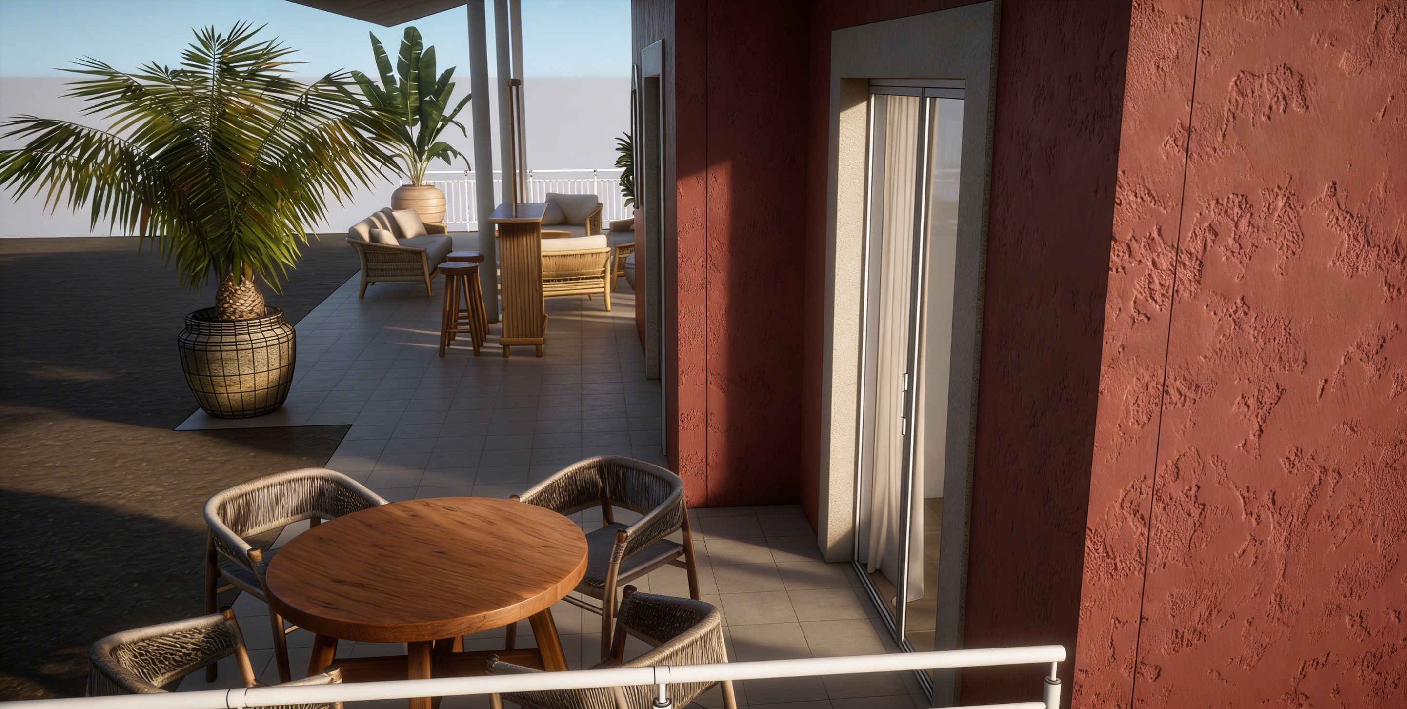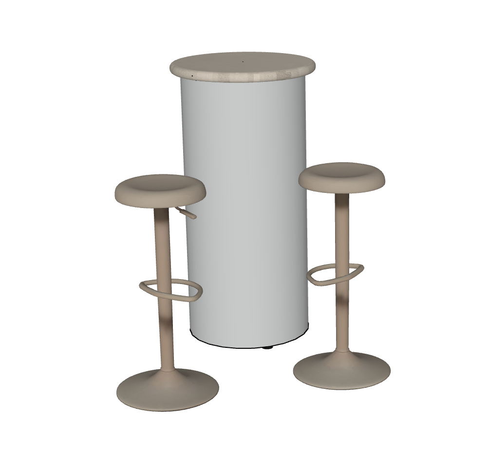 this is an image of a high table with a chrome base and sand colored mortex top next to it are 2 beige metal high stools use this furniture in a sleek and modern event setting with similar neutral colours do not change the dimensions of the furniture