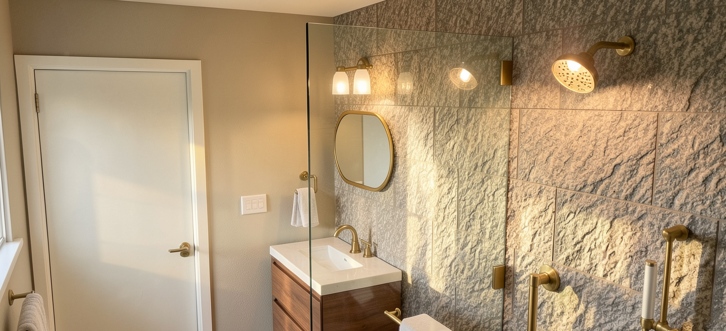 without changing the layout of this bathroom update the bathroom using the following overall style modern organic spa bathroom with warm neutral palette natural materials and clean minimalist lines color palette soft whites warm beige sand tones natural wood tones charcoal gray accents creating a monochromatic soothing scheme wall treatments primary walls in crisp white with vertical paneling or shiplap texture shower area right side featuring vertical wood look tile or slat wall paneling in light natural oak blonde wood tone narrow vertical linear pattern creating subtle texture and visual interest white trim and molding for clean contrast flooring large format tile in light gray concrete appearance matte finish with subtle texture neutral stone look porcelain creating modern seamless look shower area opposite wall from the sink shower stall with full length curtain on right wall floor to ceiling linen curtain in natural beige oatmeal on ceiling mounted track brass gold shower fixture with rainfall showerhead mounted on wood paneled wall shower curtain creates soft spa like privacy wood slat accent wall inside shower zone vanity left side floating dark charcoal black countertop with integrated or undermount white sink modern rectangular sink positioned on left wall where existing vanity is open floating shelving below in matching dark finish for towel storage brass gold single handle faucet large mirror above vanity with simple frame or frameless minimalist design without upper cabinets toilet standard white toilet positioned centrally between vanity and shower matching existing layout lighting woven rattan natural fiber pendant light in elongated teardrop shape hanging near vanity area warm ambient lighting throughout natural light maintained from existing sources accessories styling wooden branch style wall hooks mounted on left wall near entry for towels waffle weave towels in cream natural tones woven natural fiber basket on vanity shelf or floor small potted greenery on vanity counter olive branch or eucalyptus organic spa aesthetic with natural textures throughout key features emphasis on natural materials wood slats woven fibers stone look tile warm metallics in brass gold layered neutral textures clean uncluttered surfaces organic modern aesthetic mood calm spa like warm minimalism with natural organic elements