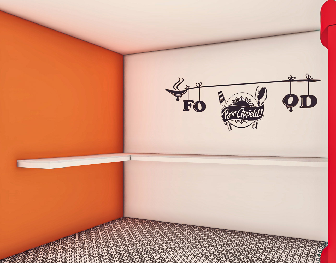 keep the sticker that consists of drawings on the wall the same keep the drawings on the wall as they are the orange wall should remain empty orange make the space more realistic with light beams