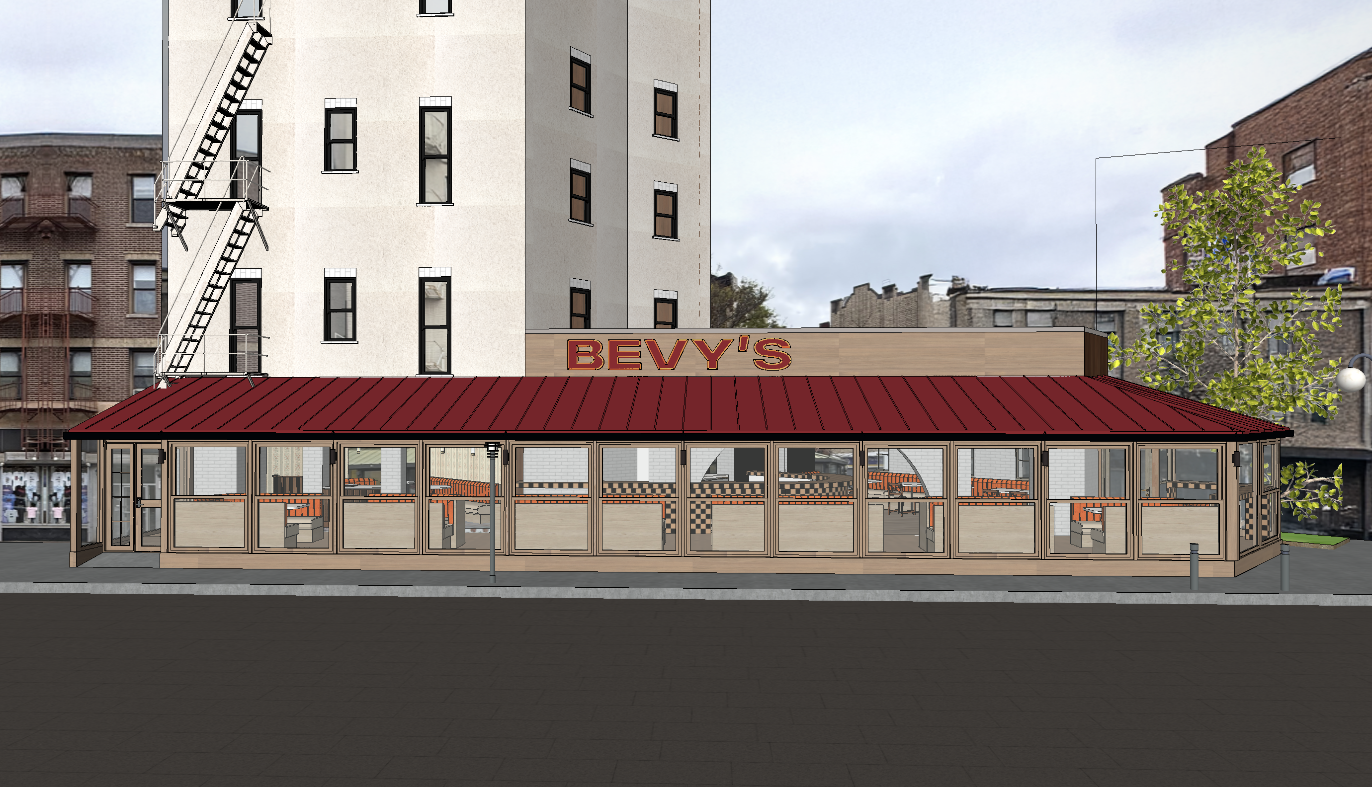 photorealistic daytime exterior of the bevy s caf in new york with a long glass enclosed terrace framed in light oak wood a light oak parapet and sign panel a deep burgundy standing seam roof bright daylight reflections on the glazing warm visible interior with orange banquettes black fa ade spotlights above the bevy s sign and a clear new york street scene with brick buildings and soft summer shadows
