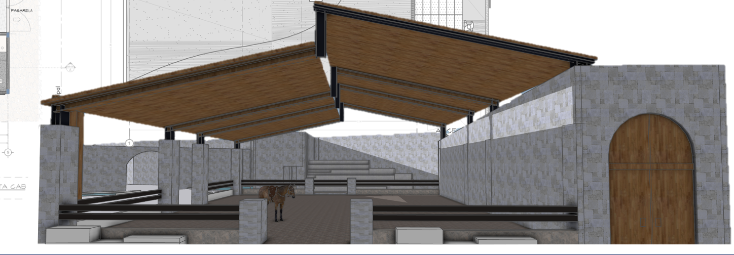exterior shot render a large open structure with rustic masonery stone walls in light gray featuring a high ceiling with exposed wooden beams in warm brown tones include an arched wooden door in rich dark brown the floor is a mix of smooth stone in neutral colors the lighting is soft and natural creating a tranquil and serene atmosphere in the center a horse stands with a gentle expression adding a touch of life to the scene the overall ambiance is peaceful and harmonious with a blend of natural textures and materials