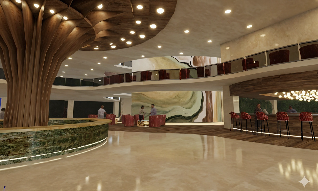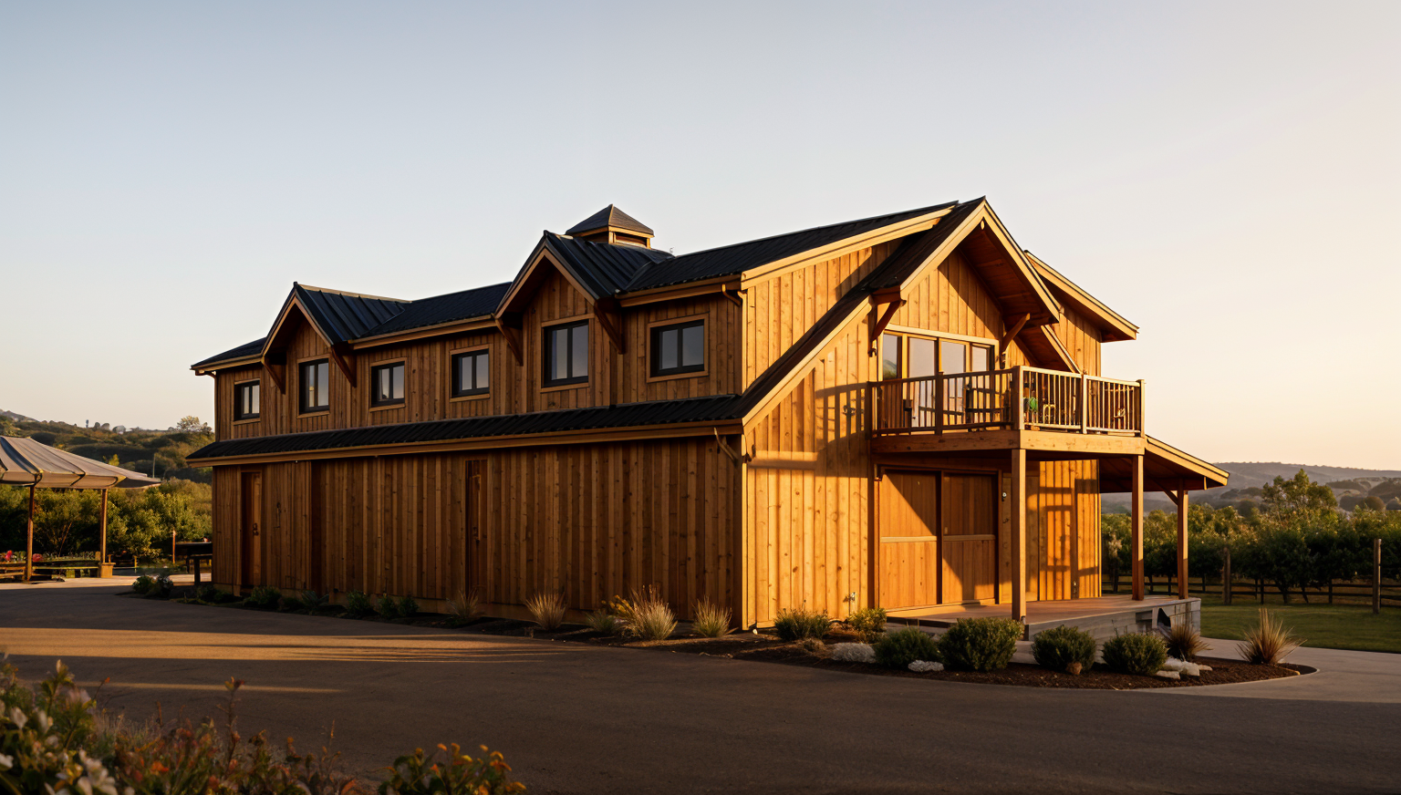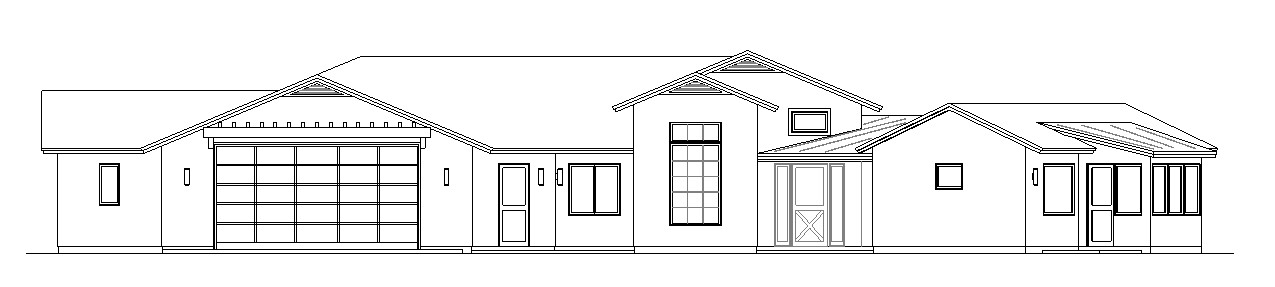 prairie style exterior shot render this elevation using the existing geometry exactly as shown apply a western americana modern farmhouse blend 60 20 20 use a light buckskin stucco body rich medium walnut stained wood accents and charcoal iron standing seam metal roofing add rustic western detailing such as heavy timber brackets exposed rafter tails a subtle star or ranch style gable accent and stone wainscot in neutral sandstone tones windows should be modern black frames with clean trim garage door should be a modern black metal framed glass panel door entry should feature timber posts and beams with a slightly rustic ranch character maintain modern crisp fascia lines minimal trim and controlled farmhouse touches like selective board and batten on accent masses only lighting should be matte black modern farmhouse lantern fixtures landscape minimal western dry with native grasses lighting warm and natural preserve all proportions and layout exactly only applying materials color palette and style enhancements architecture