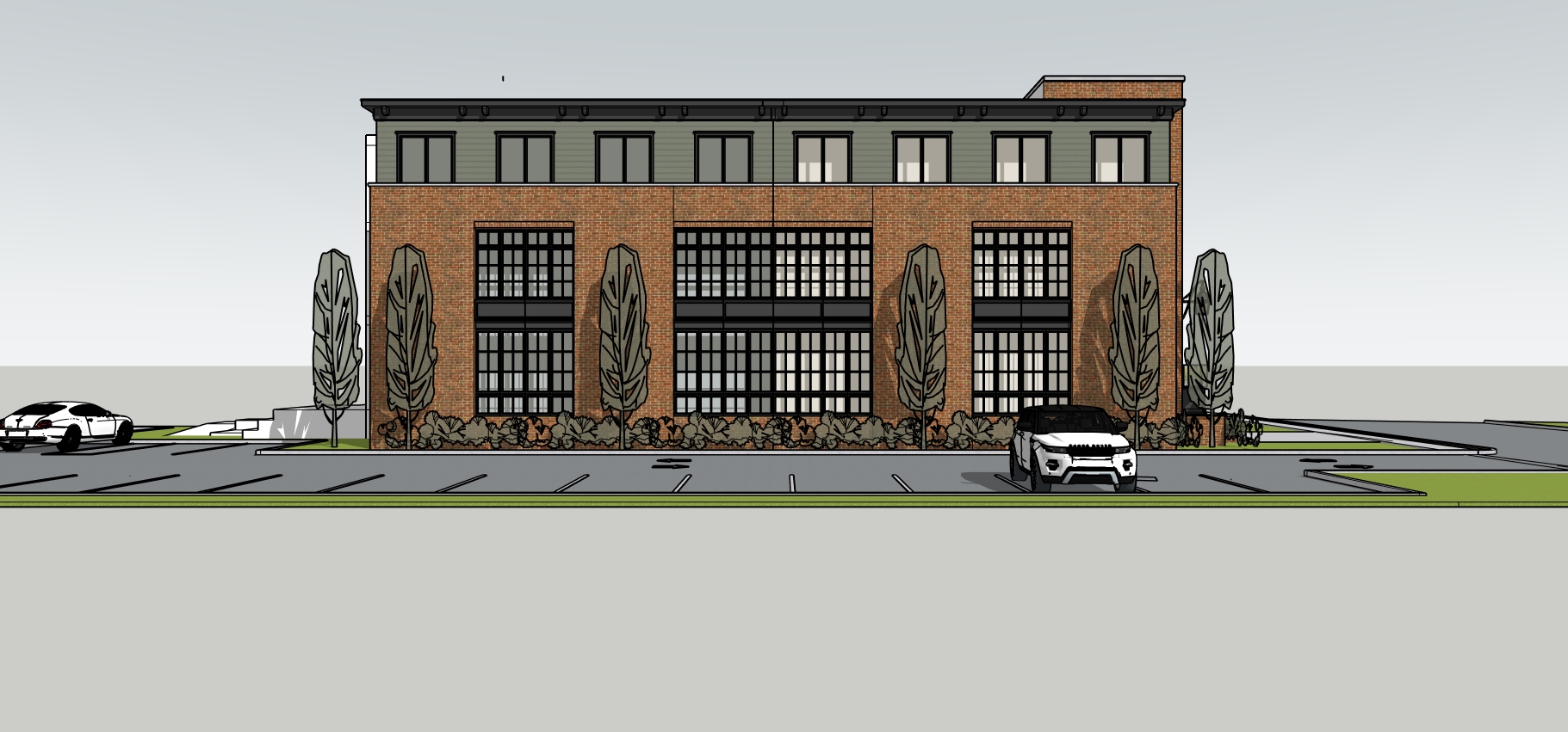 ultra realistic architectural visualization based on the provided sketchup model 100 preservation of original building massing structure and camera angle style modern industrial brick loft commercial building features exposed rustic red brick black steel framed industrial windows large pane glass architectural concrete details warm subtle accent lighting scene late afternoon sunlight high end urban environment photorealistic materials 8k resolution crisp architectural photography sharp details cinematic rendering set in a wooded environment
