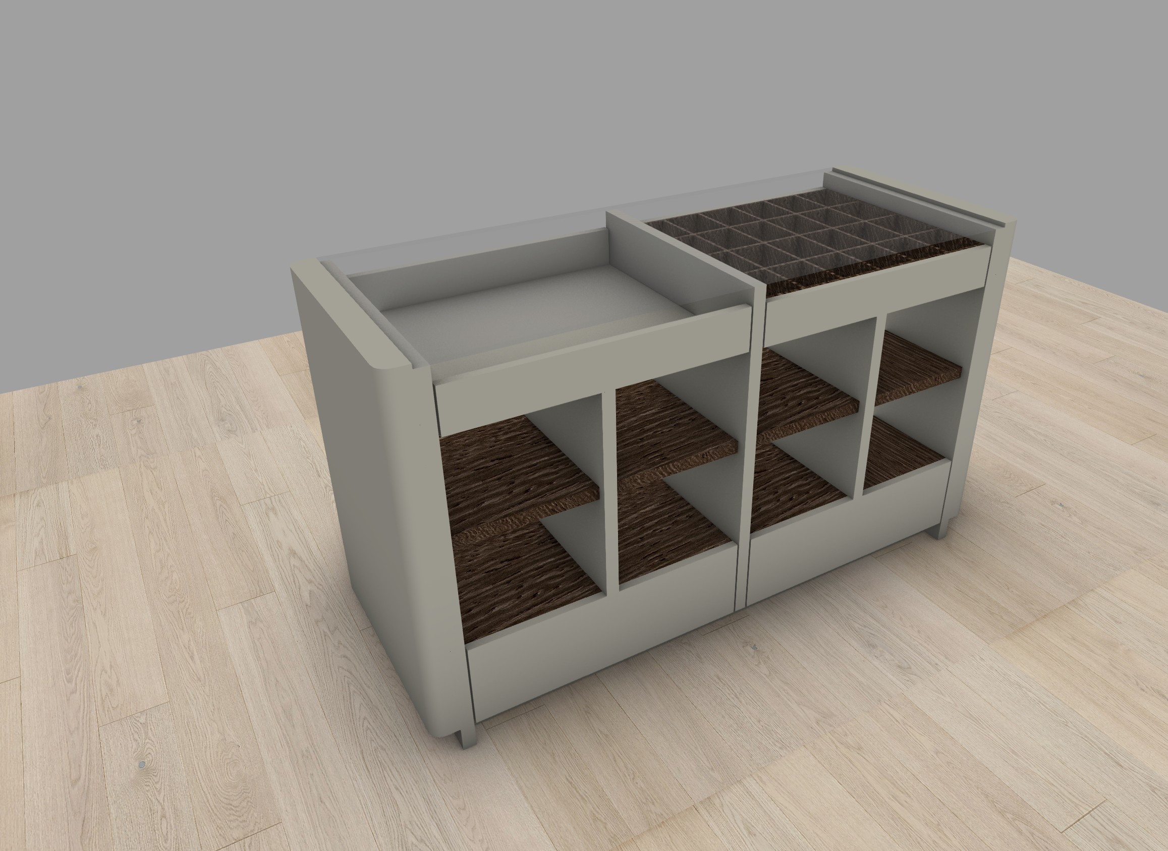 maintain design material areas and proportions make wooden shelves and locker below the top dark oak veneer surface enhance feeling of glass surface on the top pile of scythe lined shirts on the shelves