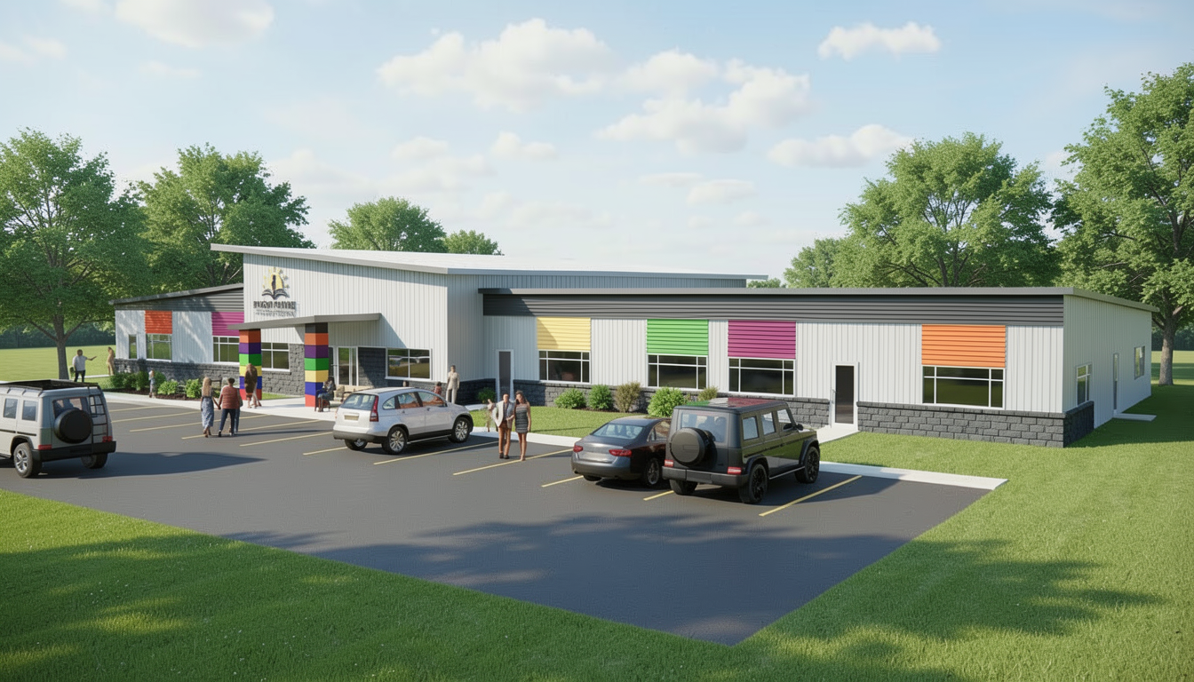 remove these two trees and add a 4 story building with a brick and stucco tuscan design with retail stores at the ground level and apartments on the top floors