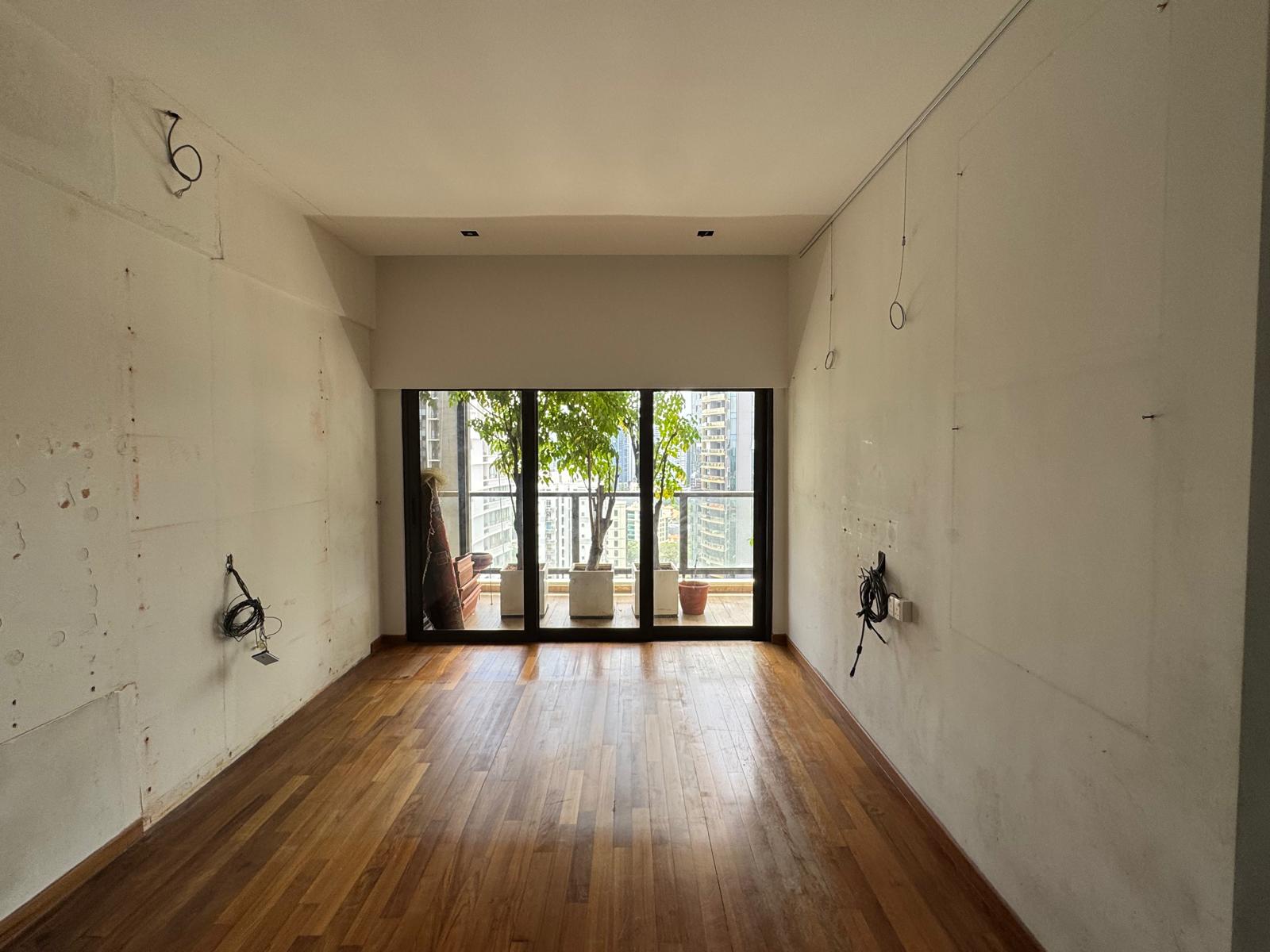 left wall to have cherry blossom wallpaper inset with a thin wooden frame around it and green paint on the outside all other walls to be in a light shade of green paint