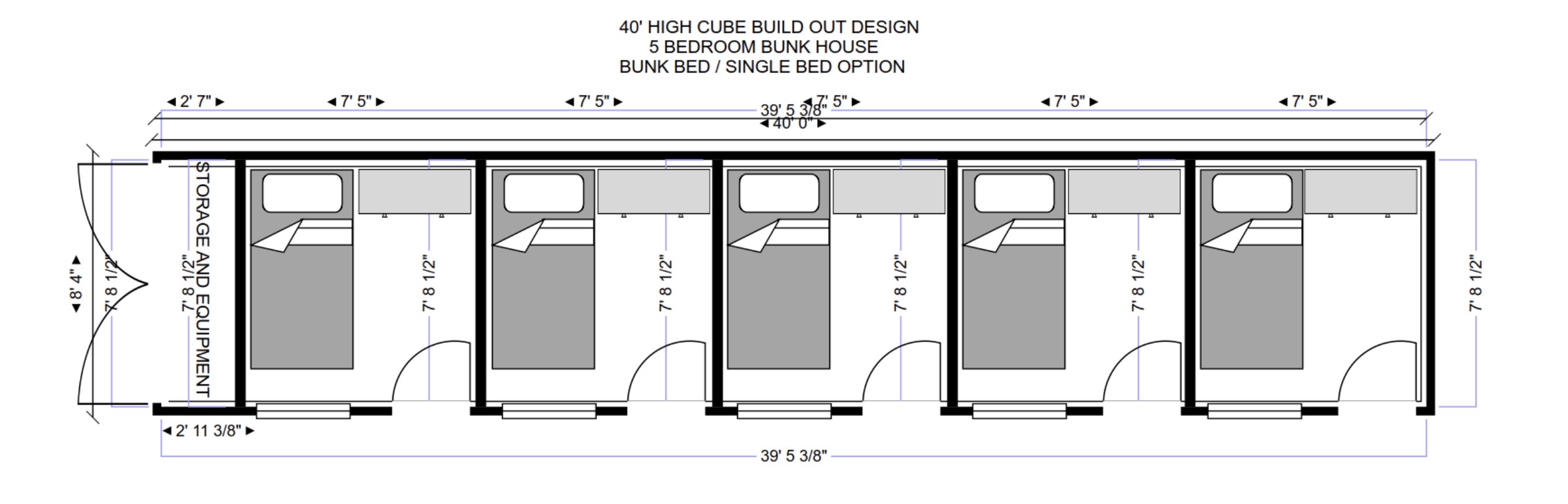 zaha hadid interior shot create a highly realistic architectural rendering of a 40 high cube shipping container bunkhouse build out based exactly on the attached floor plan layout accuracy requirements rendering must be dimensionally accurate and proportionate to the provided plan wall thickness room sizes door locations and bed layouts must match the floor plan exactly include the text labels shown at the top of the floor plan identifying each space s purpose no artistic distortion or exaggerated scale spaces left to right storage and equipment room at entry five individual bunk rooms bedrooms each bedroom sized approximately 7 8 1 2 deep each bedroom contains a bunk bed or single bed option as shown individual doors opening into each room windows placed consistently along the container wall as shown in plan create me an top down cutaway view and an exterior elevation view architecture