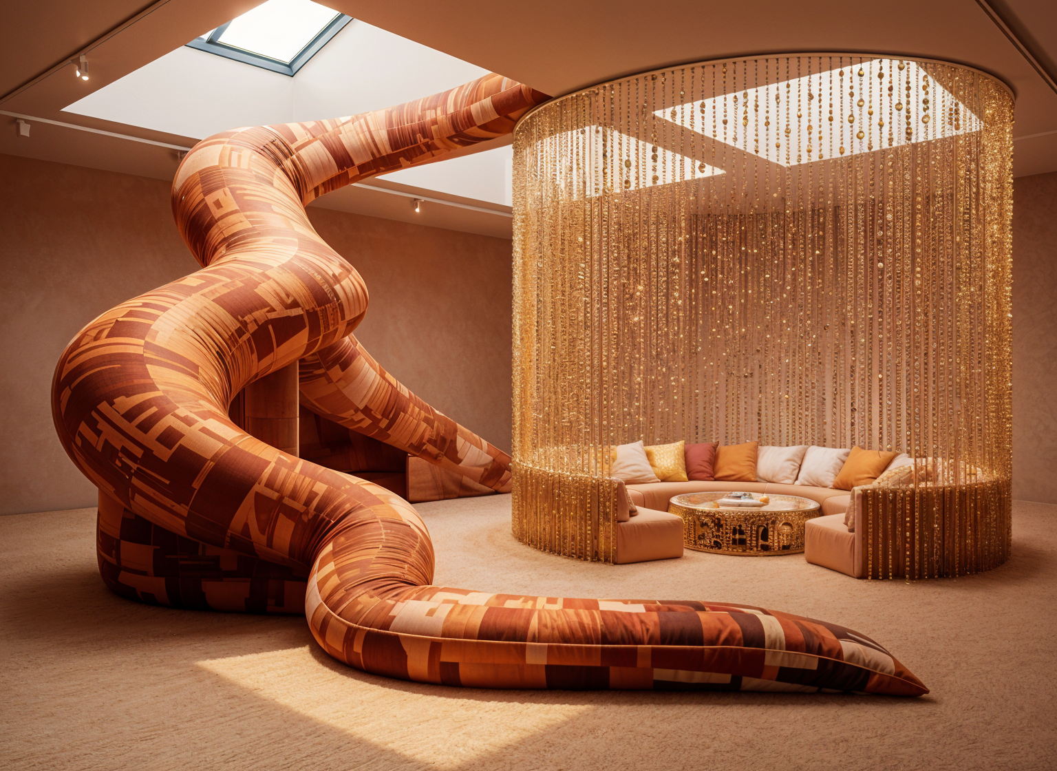 postmodern interior shot postmodern exhibition playground with beats big wooden ramp with fabric on and conversation pit with beads in the middle all warm colour no windows small beads colorful warm colors everywhere and projection in behind and glass tubes architecture