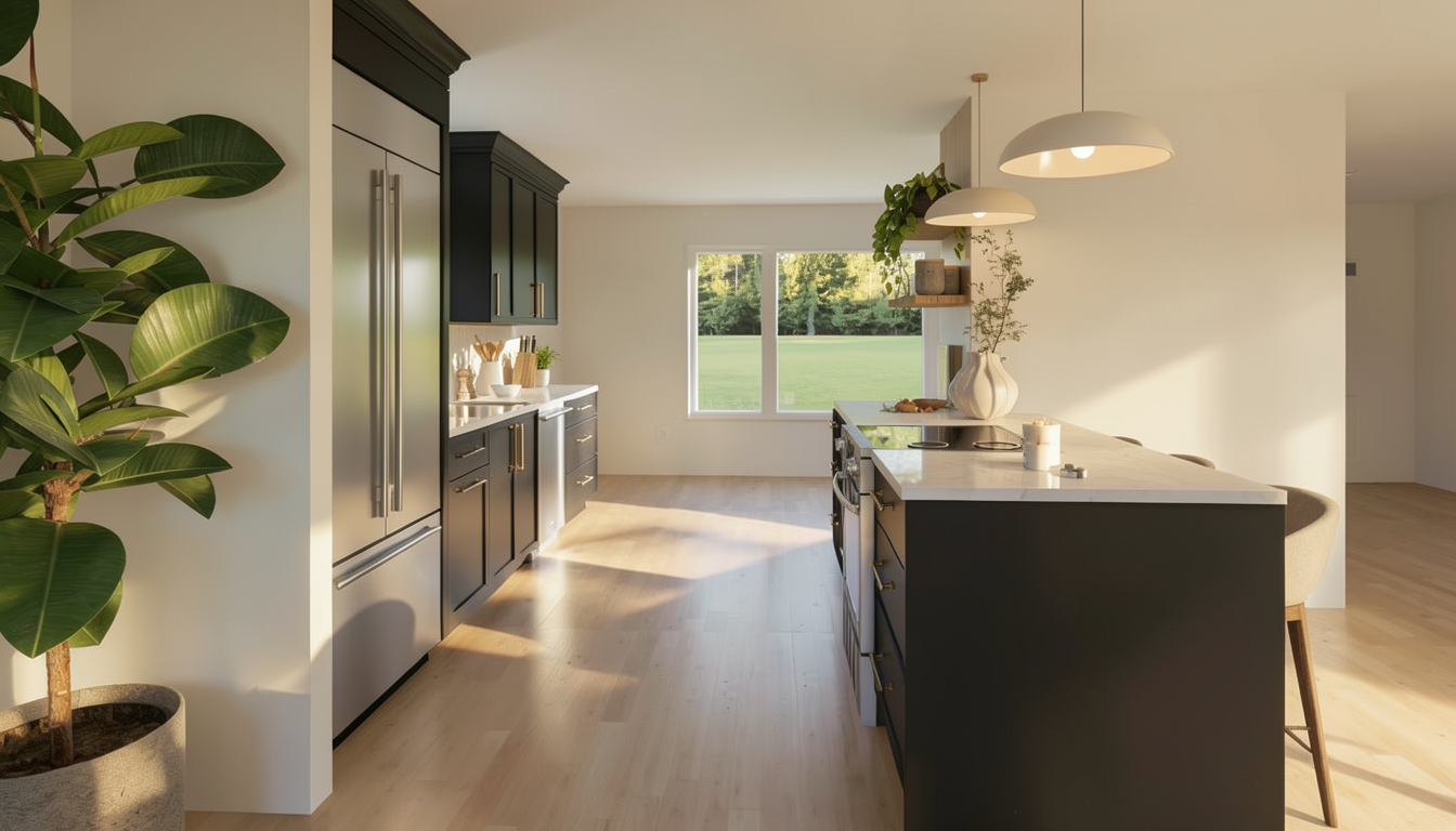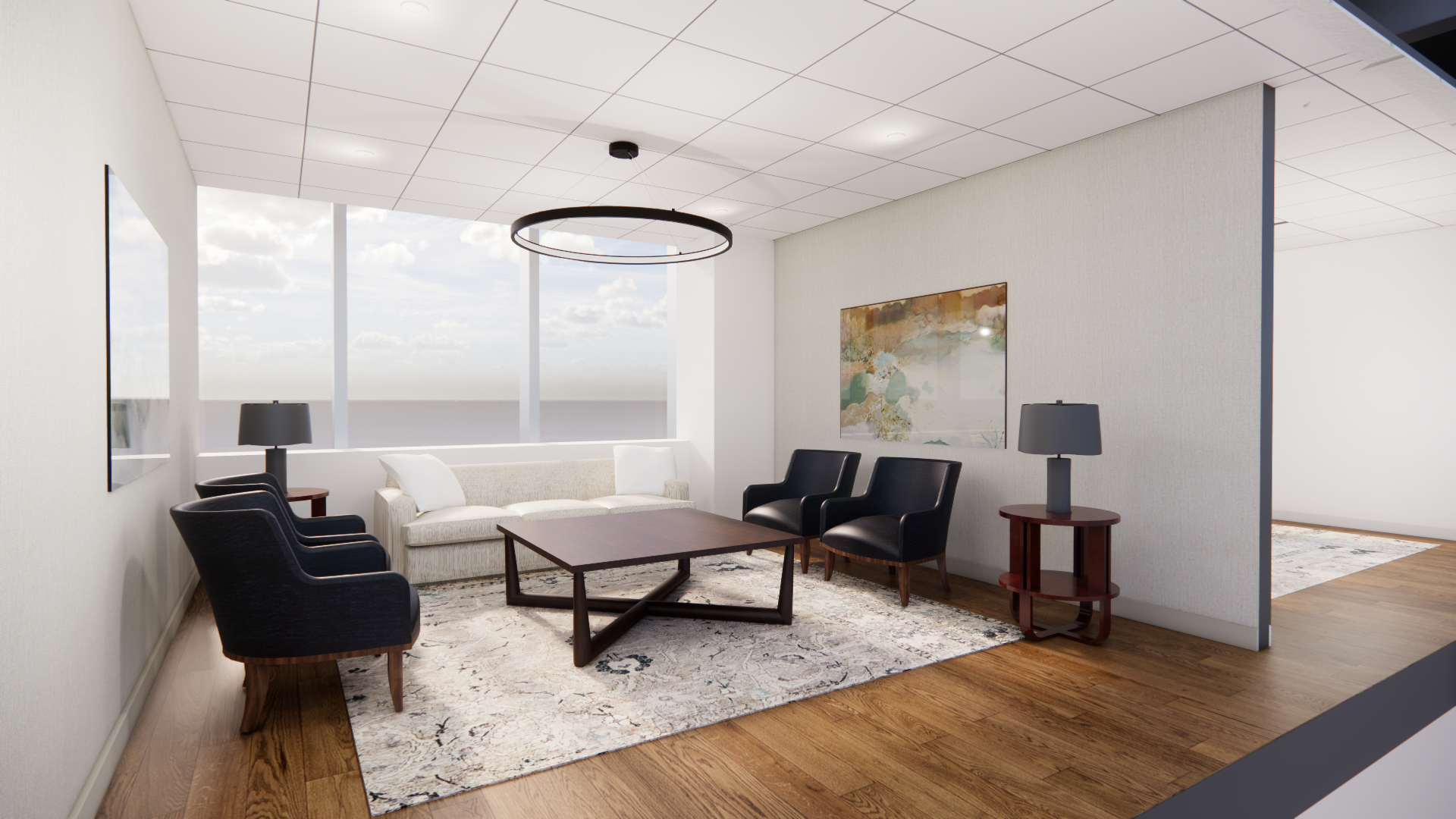 create a photorealistic rendering add midtown new york views from the 43rd floor preserve geometry materials and textures as they are change the color of the two table lamps to dark brown leather base and linen color shade keep the shape change the fabric on the four existing chairs to soft dark blue