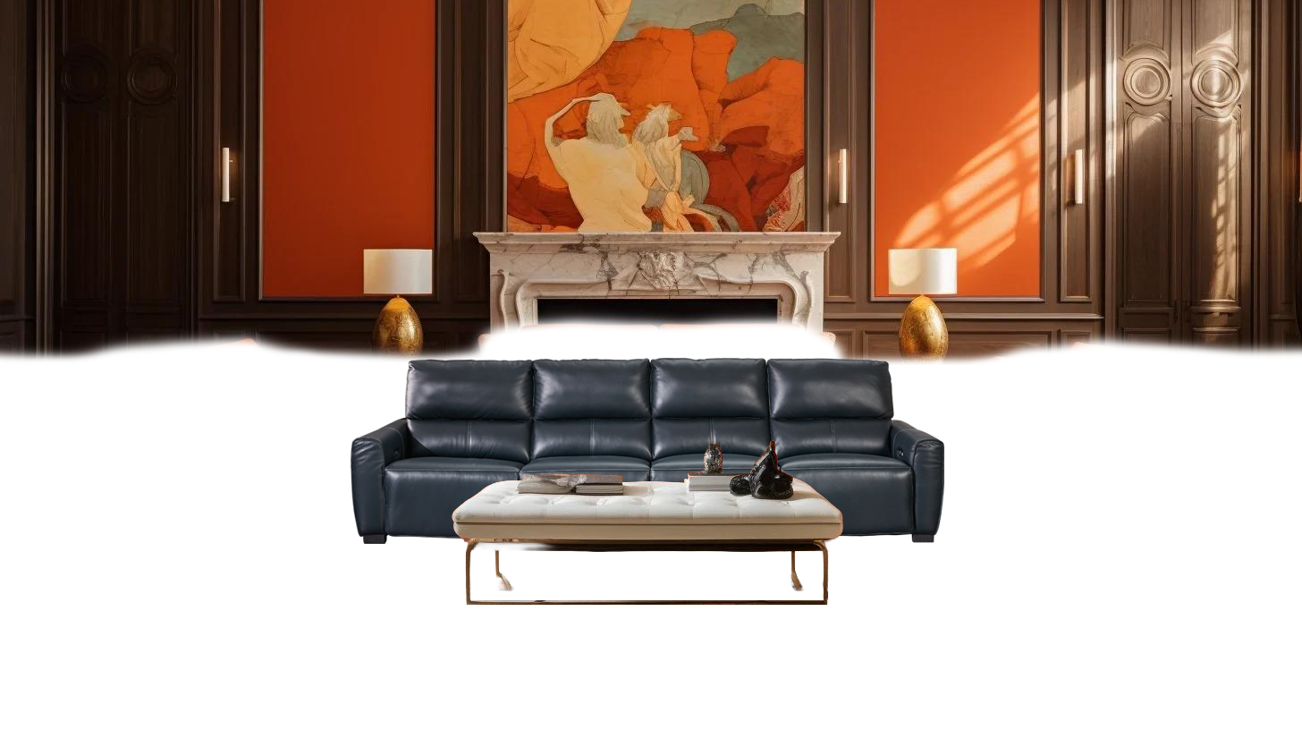 the luxurious living room exudes a refined and elegant ambiance dark mahogany paneling accented with vibrant orange accents adorns the walls a grand white marble fireplace serves as the focal point topped by an abstract painting in red and soft gray in front of the fireplace a comfortable dark blue leather sofa exudes elegance complemented by a sleek white tufted ottoman deep espresso wood floors and modern elegant lamps cast a soft warm glow creating a warm and inviting atmosphere