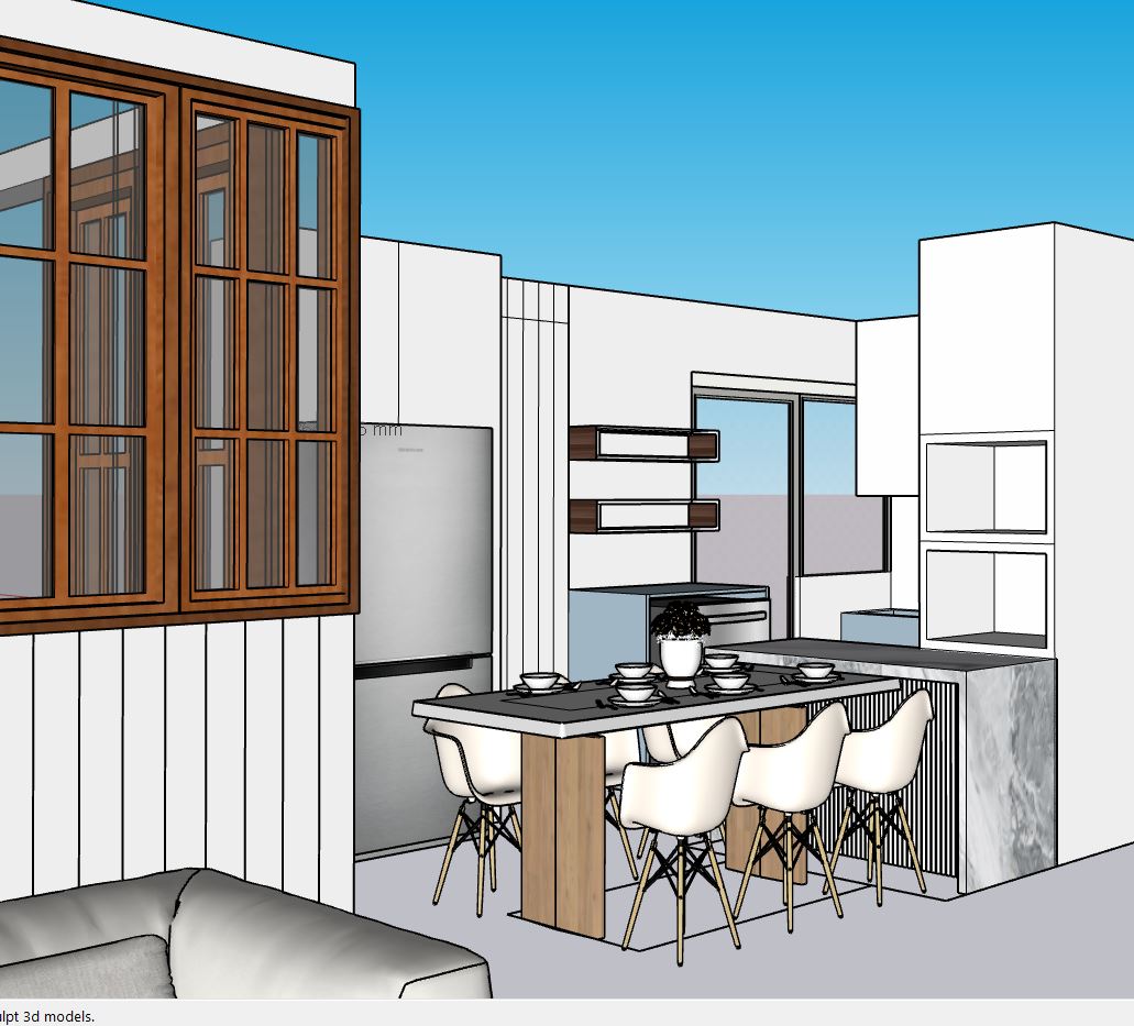 create a hyper realistic interior render of a japandi wabi sabi kitchen and dining space based on the provided sketchup model and layout the design features a kitchen island seamlessly joined to a dining table forming a continuous sculptural volume the island and table use warm light oak laminate with subtle wood grain soft matte finish and clean minimalist edges the dining table top is slightly thinner than the island for visual lightness the island base incorporates vertical fluted panels in matching wood tone wrapping around the side that faces the living area this fluted panel continues vertically to form a hidden flush toilet door fully concealed within the fluted wall design with no visible handle and a push to open mechanism adjacent to the island a full height fridge storage cabinet is integrated seamlessly into the carpentry finished in the same japandi laminate color for a cohesive built in appearance kitchen cabinetry is finished in soft japandi neutral laminate tones warm beige light oak and muted greige with minimal handle profiles or concealed pulls upper cabinets are kept visually light with selected open shelves in wood for balance flooring is finished in large format creamy grey porcelain tiles matte finish with subtle stone texture low contrast veining and warm undertones to complement the wood elements tile color and texture are carefully matched to the overall japandi palette a service yard sliding glass door is positioned at the kitchen end featuring slim dark bronze or black frames with clear glass natural daylight filters through the glass softly illuminating the kitchen and dining area dining chairs are minimalist with cream upholstery and timber legs complementing the island table joinery table styling is subtle and lived in with neutral ceramics and a small organic centerpiece lighting includes soft natural daylight combined with warm ambient lighting 2700k 3000k add discreet under counter lighting and gentle wall wash to enhance textures without harsh contrast overall mood calm warm minimalist functional and timeless with strong japandi proportions and wabi sabi material honesty camera angle eye level interior perspective slightly wide 30 35mm equivalent capturing the island to dining junction fluted hidden door and service yard glass door style keywords japandi wabi sabi muji inspired natural wood fluted panels concealed doors architectural realism warm neutral palette