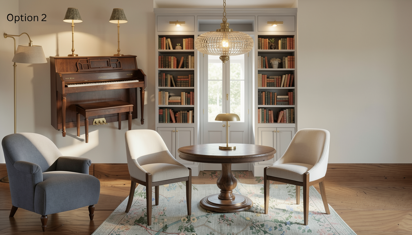 make the light fixture above the table more traditional but the size is good remove the knots from the floor and make the cabinets a little darker