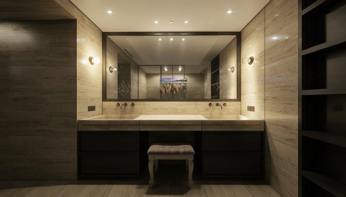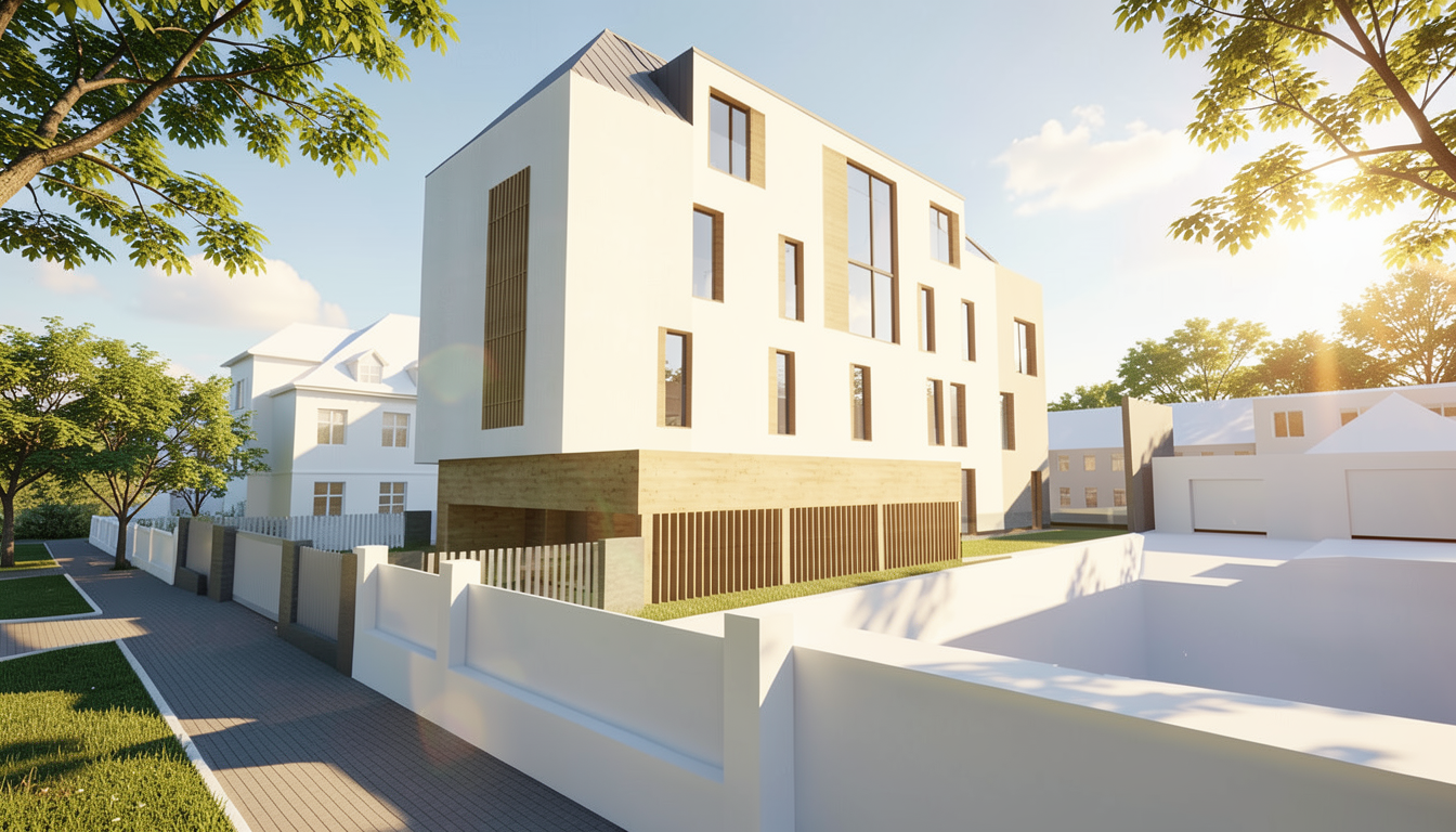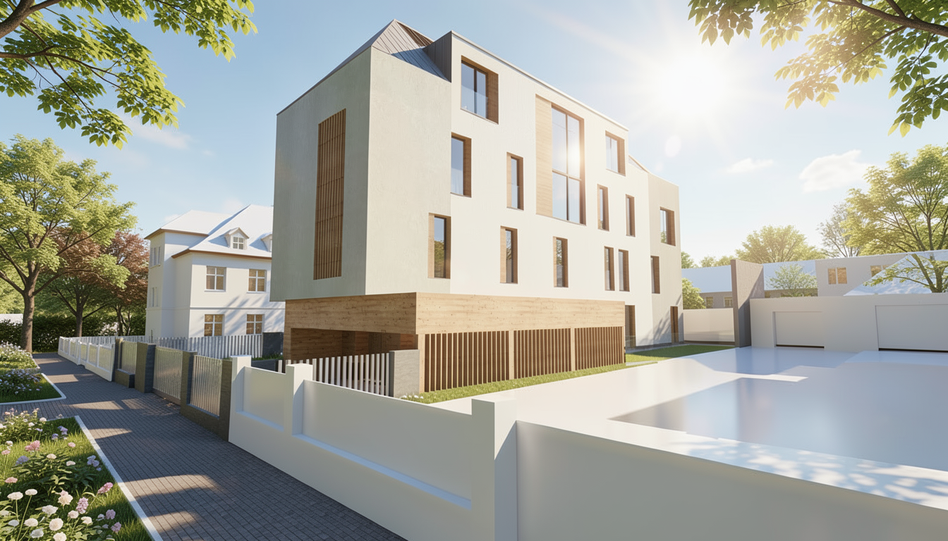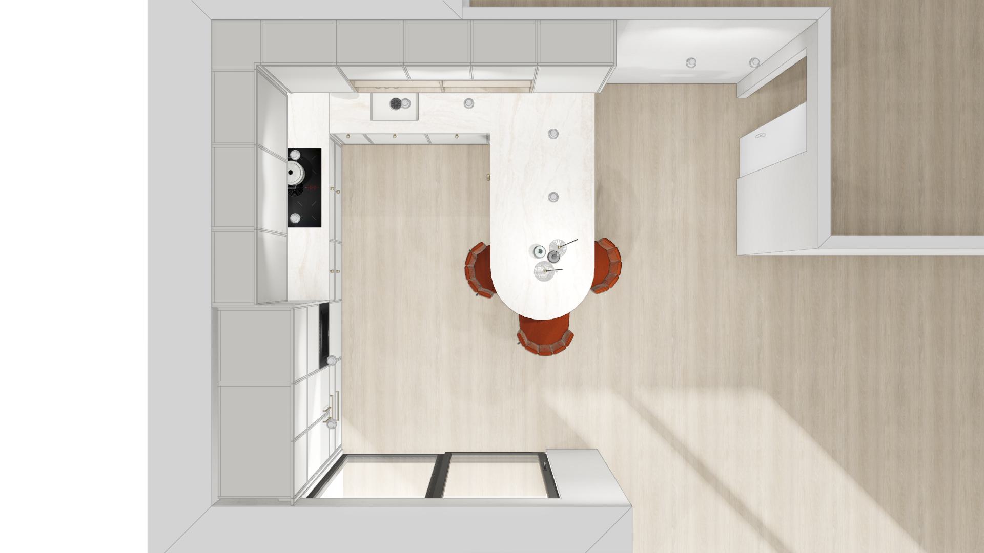 modern kitchen minimalistic design white cabinets with clean lines sleek black appliances two stylish pendant lights hanging from the ceiling with gold and metal tones elegant marbled backsplash in soft beige tones the countertop is smooth and white complementing the natural light wood floor two vibrant reddish brown leather bar stools with black metal legs stand in contrast the atmosphere is bright airy and inviting with natural light streaming through large sliding glass doors creating a serene and sophisticated ambiance