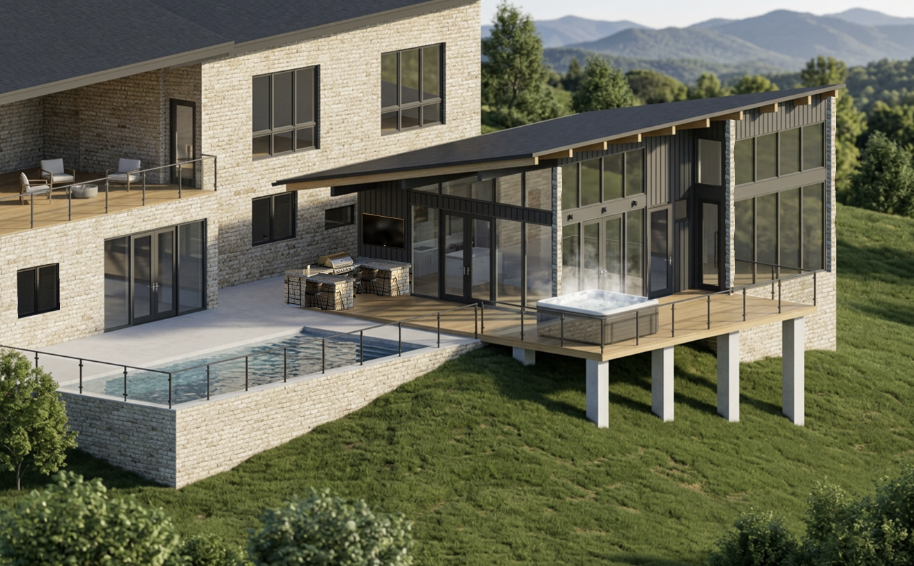 clean up the outdoor kitchen add a lounge patio set to the right of the hot tub on the deck