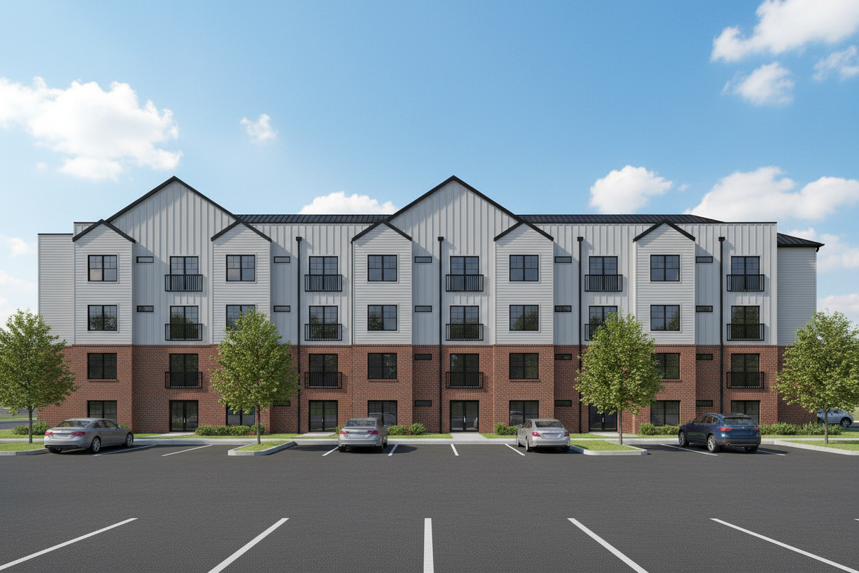 exterior daytime rendering for an apartment building combination of brick and fiber cement siding black windows railings parapet cap and downspouts parking in front of the building with small deciduous trees at every other bay primary roof is flat with a parapet no standing seam or shingled roofing is visible from this angle