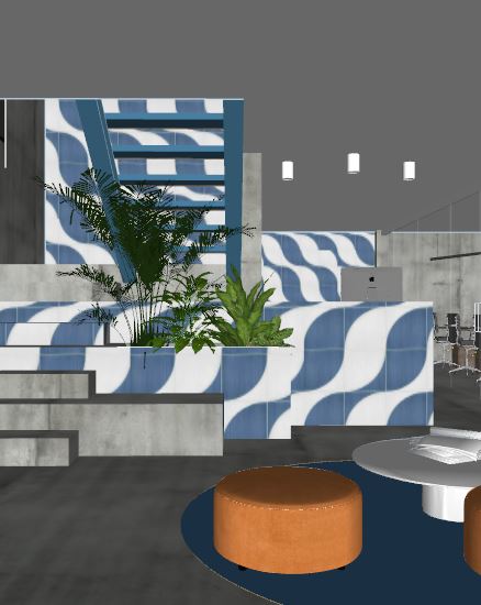 photorealistic interior render based on the original scene composition unchanged layout and camera matte wave effect porcelain surface integrated in the design floors and walls in polished concrete with subtle tonal variation and realistic texture marble table with natural veining refined and non glossy finish poufs upholstered in dense texture fabric in a matching tone soft but structured appearance blue vinyl rug with textile effect slightly matte realistic fibers simulation lighting combines soft natural daylight with carefully designed interior lighting creating a poetic atmospheric mood with gentle contrasts and depth add a receptionist behind a computer naturally integrated into the space realistic posture important ensure correct and realistic stair depth and proportions accurate tread dimensions no distortion or exaggerated perspective physically accurate materials pbr no plastic look no artificial shine editorial architectural style