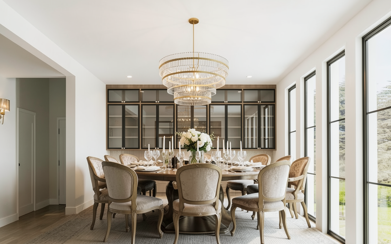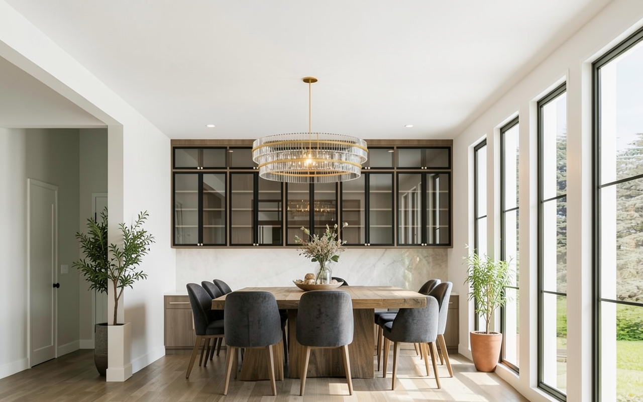 do not change the back wall cabinet can you add a 12 foot rectangular dining table make it rustic wood and modern rounded chairs make sure the table is further away from the cabinets about center to the room make it run parallel to the windows
