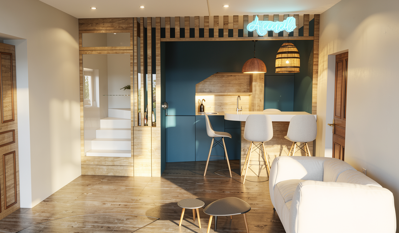 put the grey tiles to the floor also add a wooden frame at the edge of the tiles like a listelo