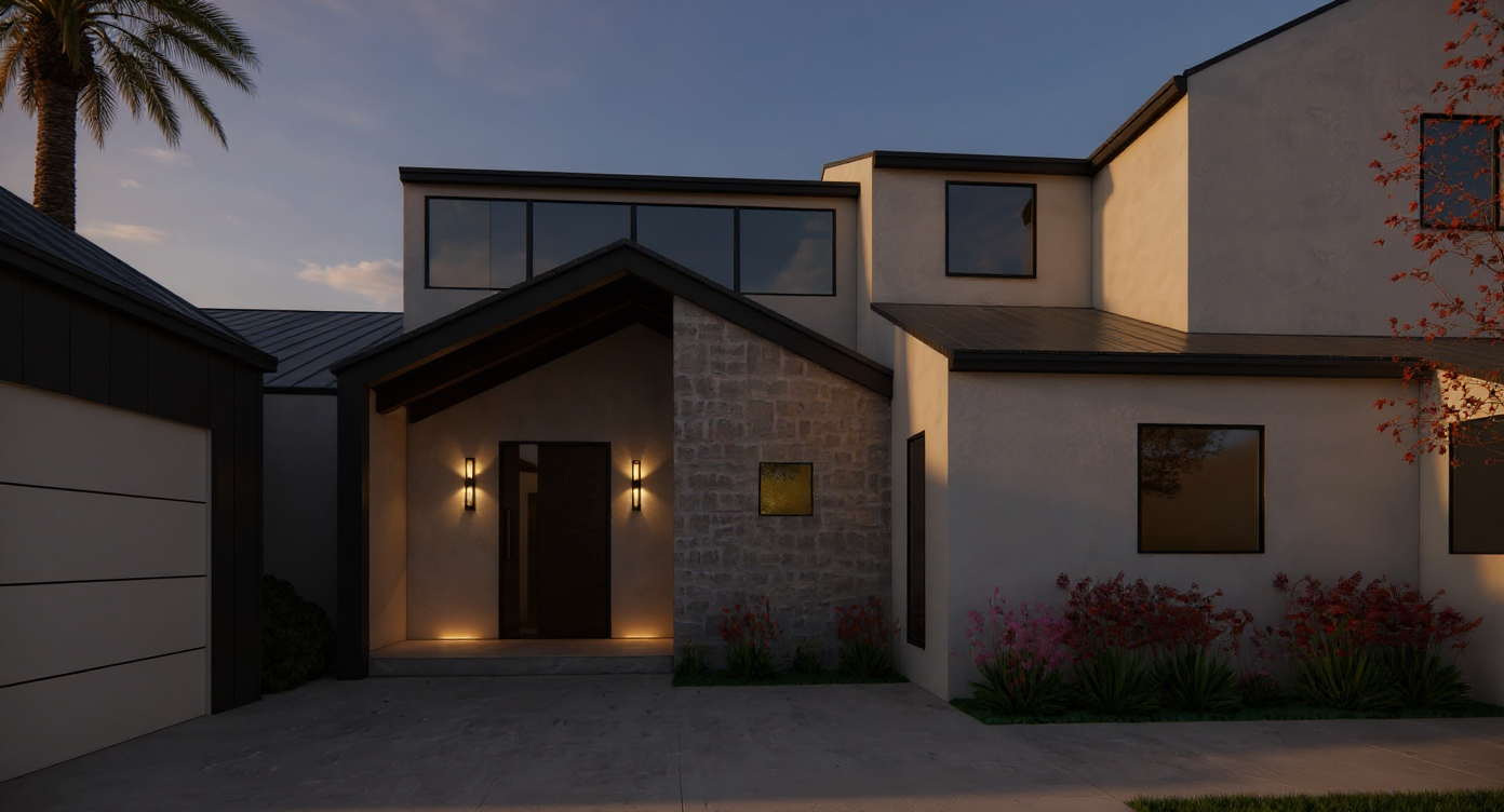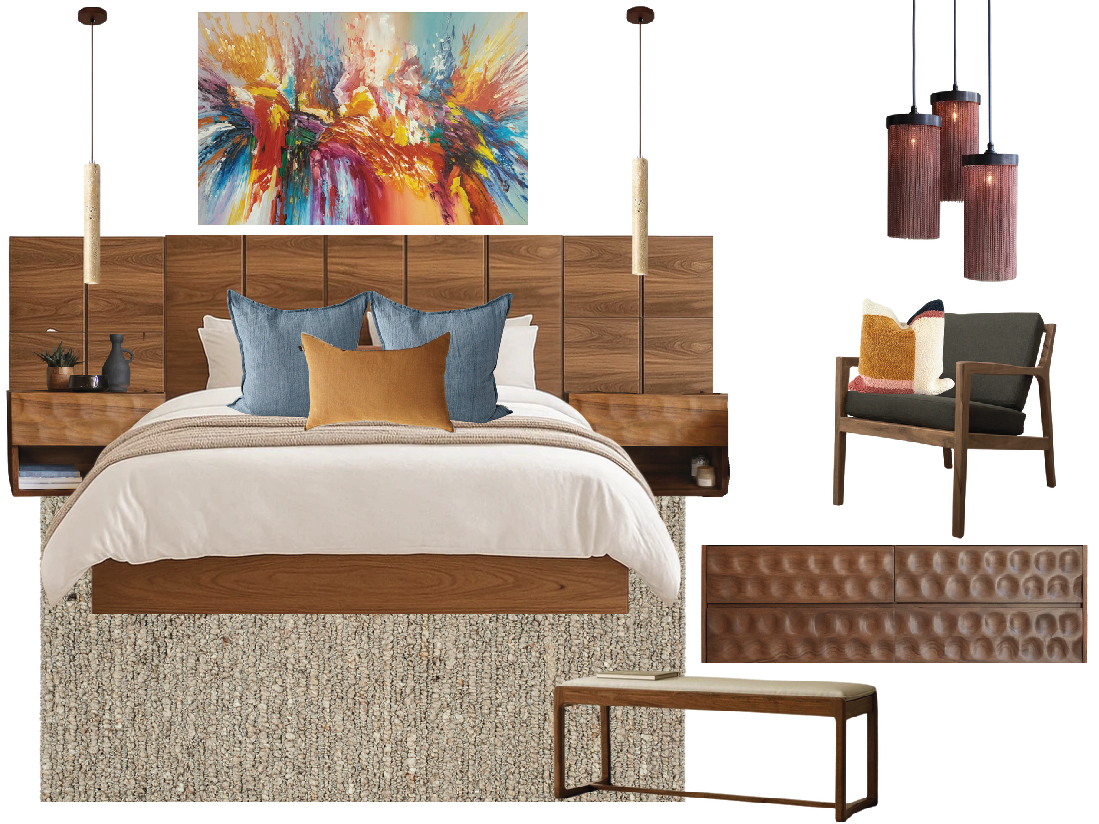 interior shot front view of the master bedroom floating nightstands made of solid wood matt finish with a slotted panel for the headboard two accent paintings in vivid colors with a dominance of blues as visual decoration totally timeless and monochromatic furniture