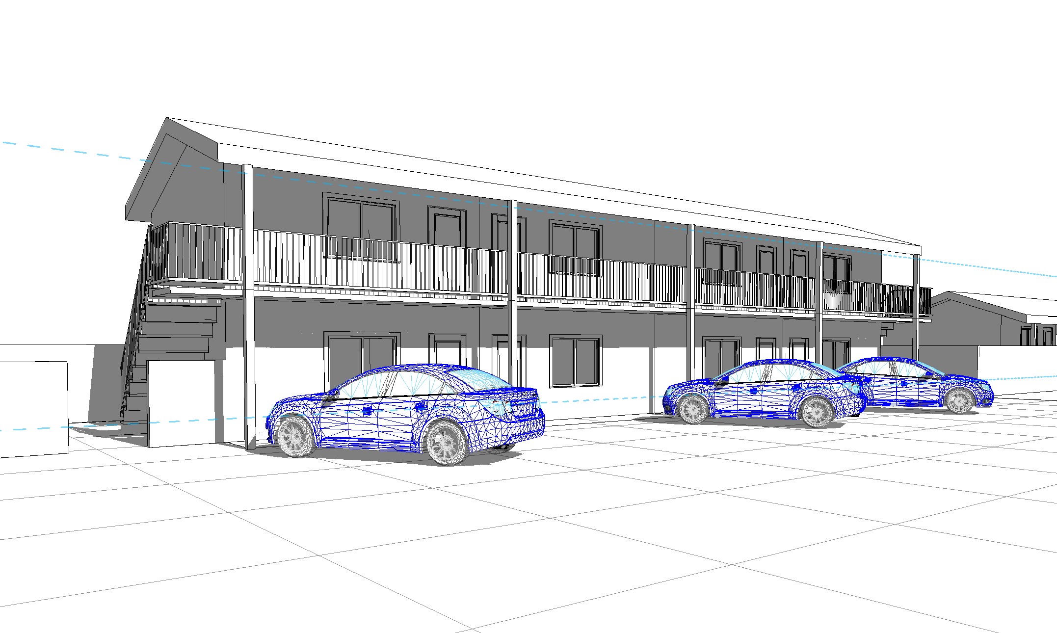 render image with bright white cement plaster walls and black posts and railings black doors and trims charcoal gray roof shingles with black rain gutter and downspout add white brick veneer on ground floor walls painted white all asphalt concrete paving at front add california native trees on a bright california summer day sun shining at front of building make all cars different brands and differebt colors no concrete curb at paving just flat surface add people on second floor and first floor walking
